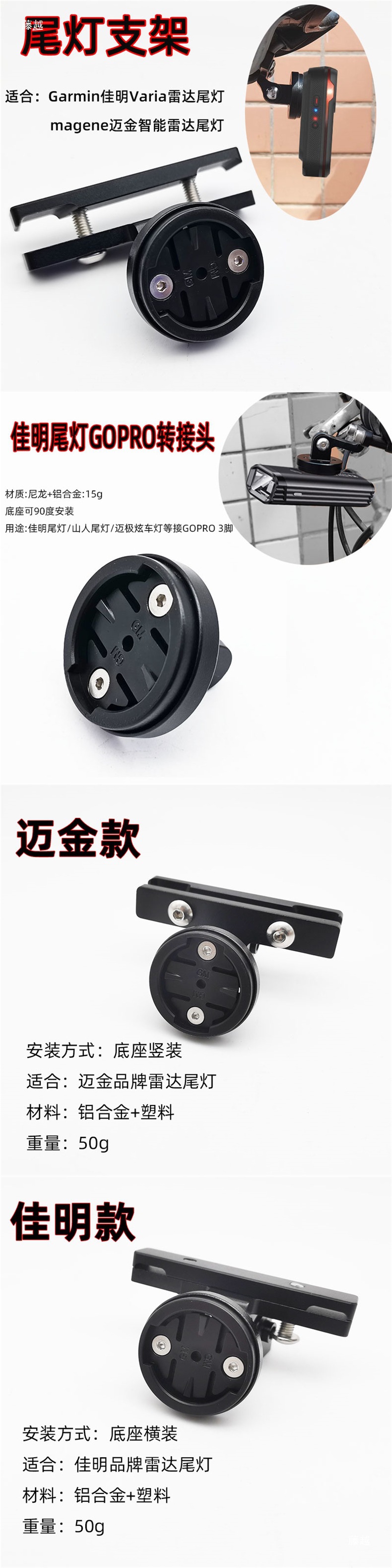 ガーミンテールライトブラケットセット,シートバッグテールボウGOPRO拡張ラック,Garmin カーライト GOPRO コネクタ,Maijin テールライトブラケットのセット,Bairuiteng テールライト ブラケットのセット