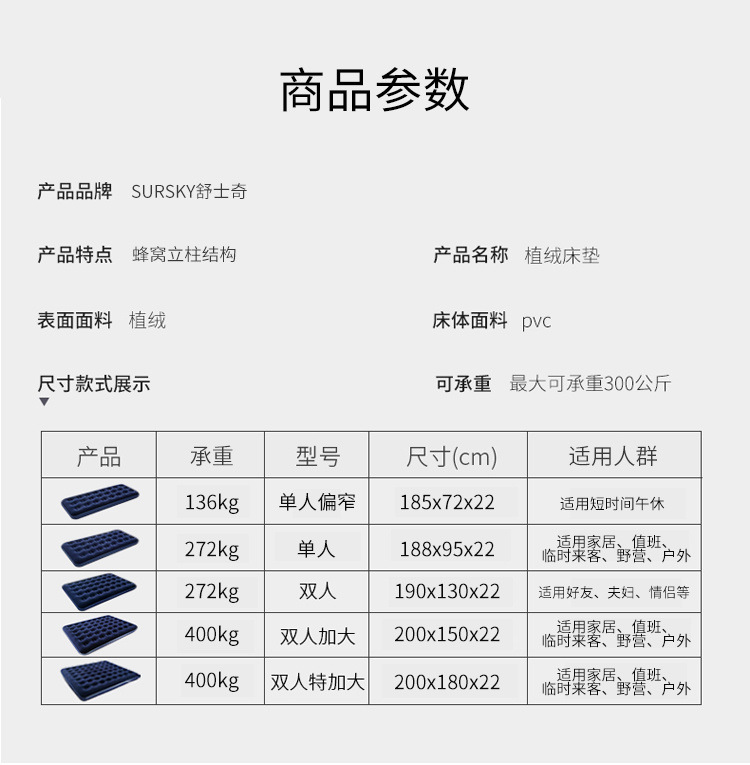 190*72*22 (シングルベッド),190*95*22 (シングル拡大),190×130×22(ダブル),200*150*22 (ダブル拡大),200*180*22(トリプルベッド),190*95*42 (二段ベッド)