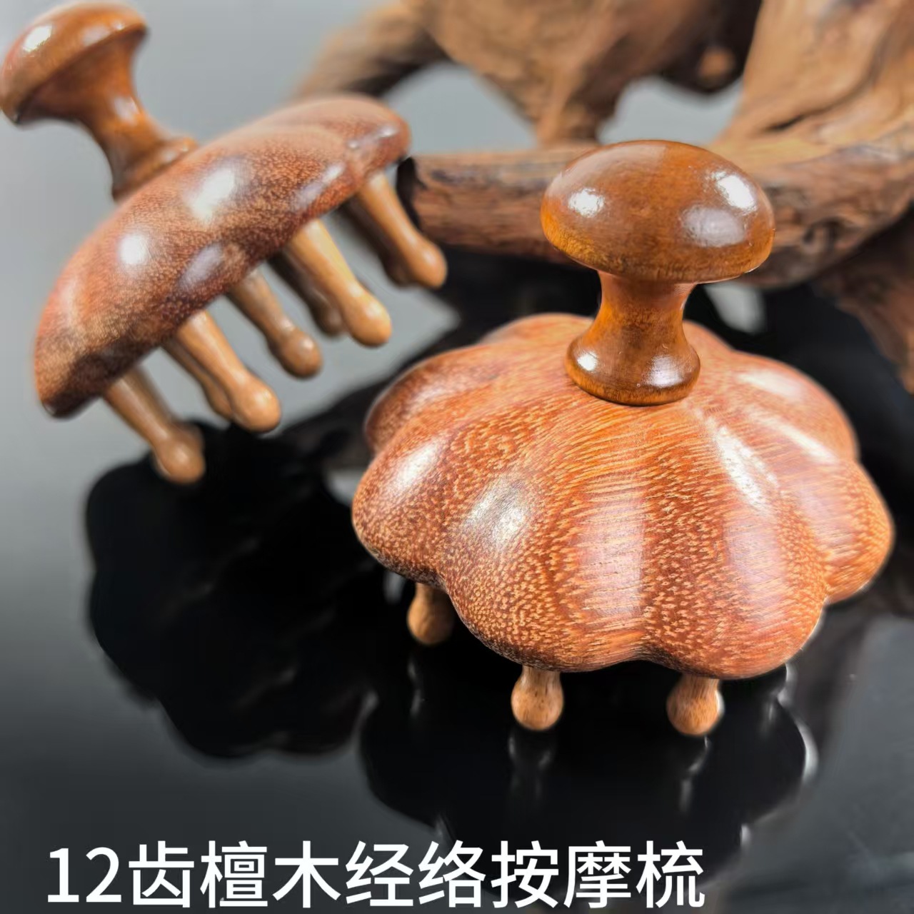 天然龙凤檀木12齿钉钉按摩梳圆形南瓜形状木质实木经络按摩梳子