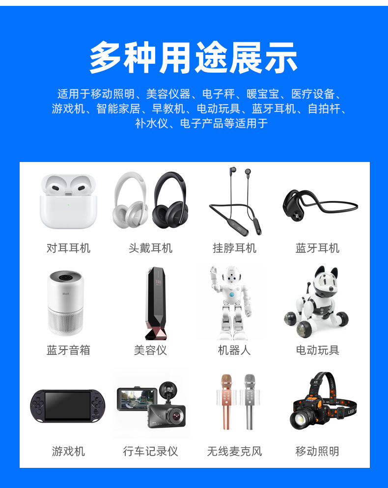 适用类型 蓝牙耳机,录音笔,金属探测仪,自拍杆,洁面仪,水表电池,mifi电池,可穿戴设备,手雷电池,便携式投影仪颈椎按摩器美颈仪智能音响挂脖风扇露营灯笔记本电脑,音响/风扇/视频机,游戏手柄 搅拌杯
