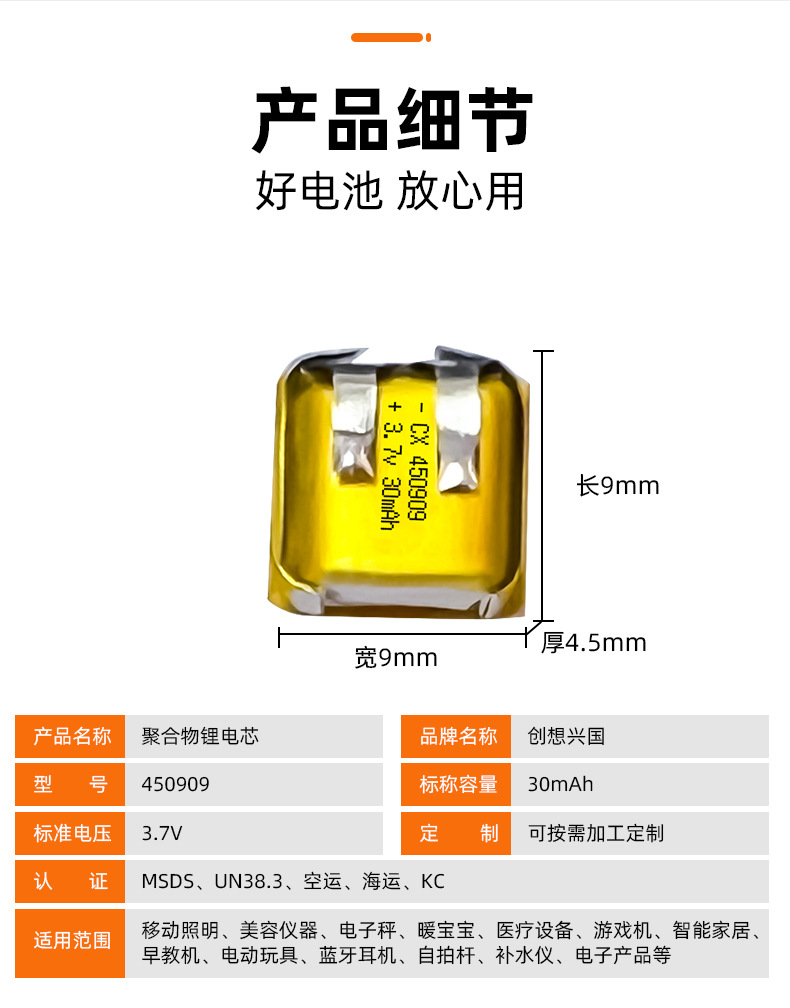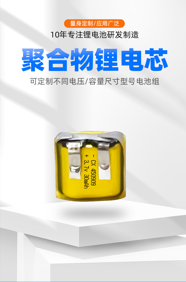 聚合物锂电芯450909-30mah蓝牙对耳耳机U盾自拍杆电芯电池电芯