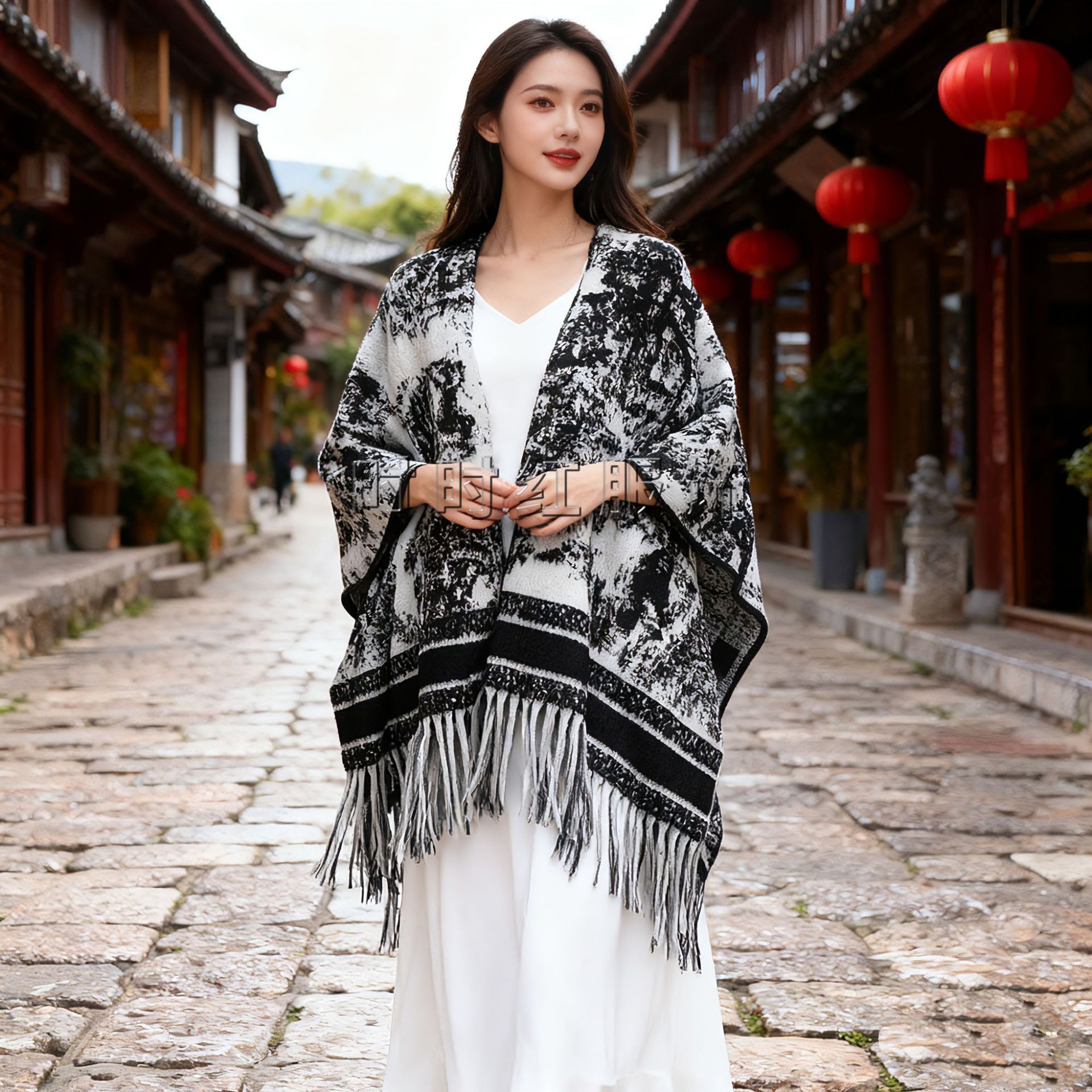 2025新款仿羊绒山水画民族风女围巾披肩羊绒斗篷披风高级感外搭