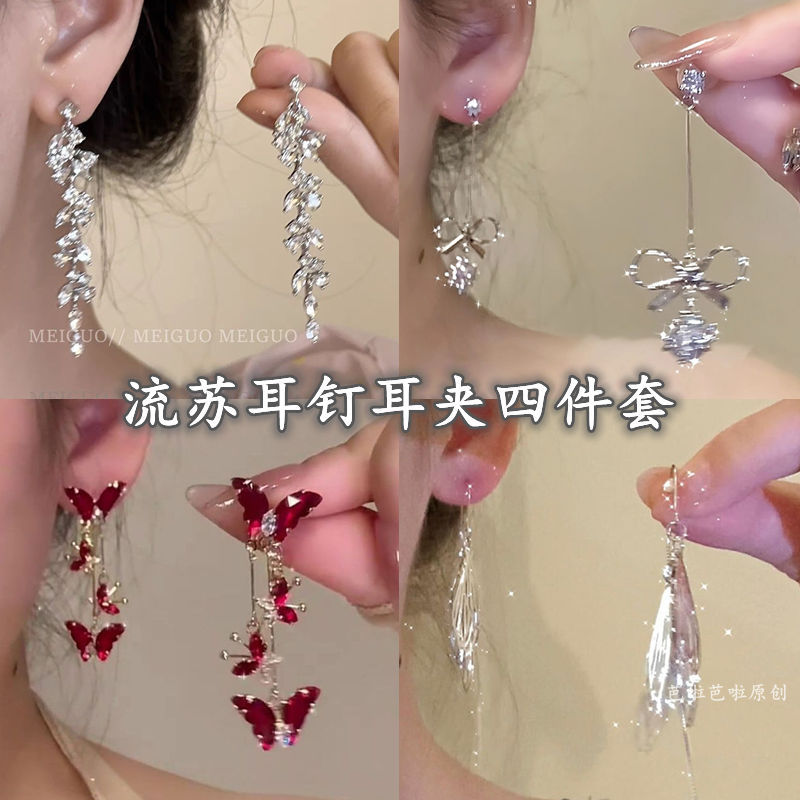 シルバーのロングタッセルジルコンイヤリング、耳クリップ、四角顔と丸顔向けのスリムなデザイン、気質イヤリング、多用途の高級イヤリング