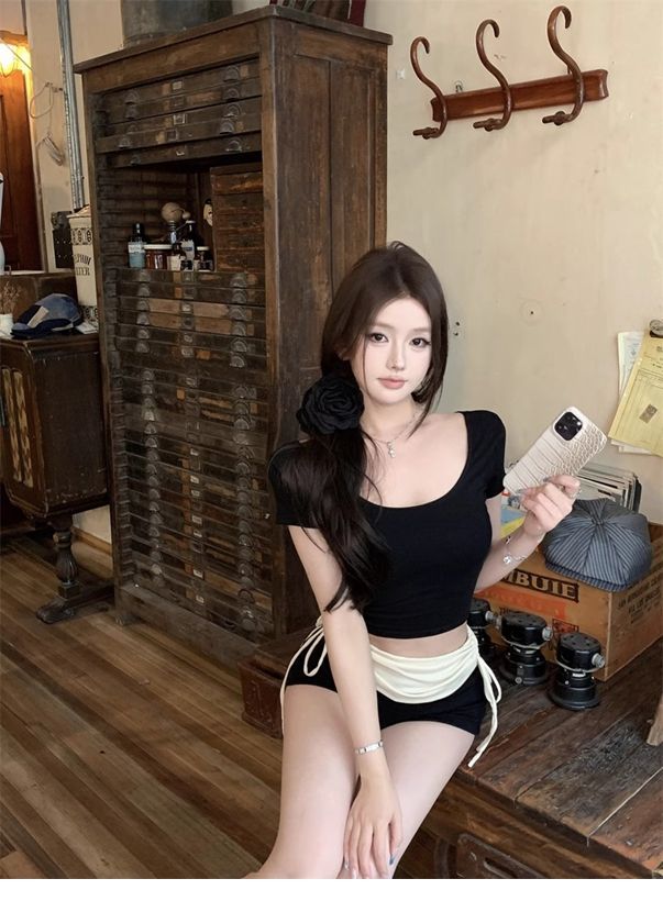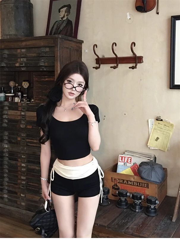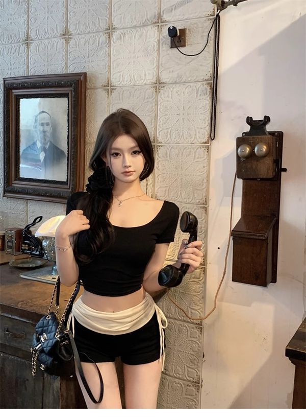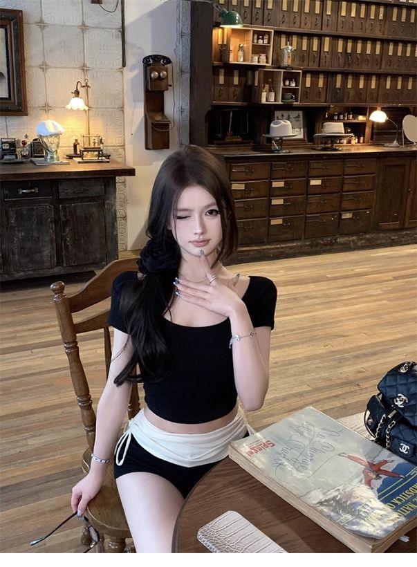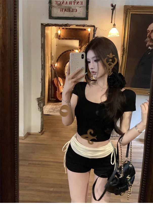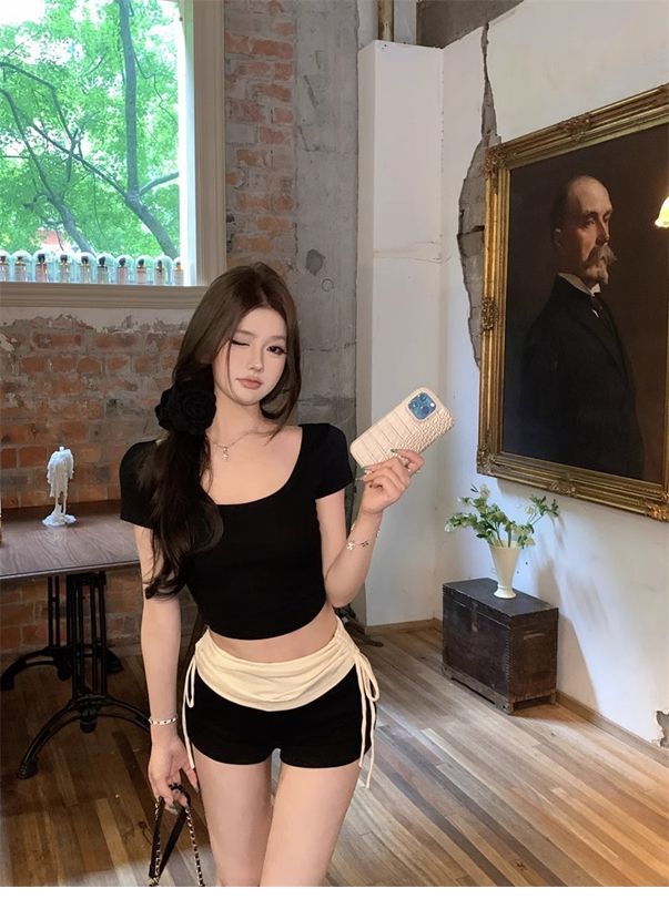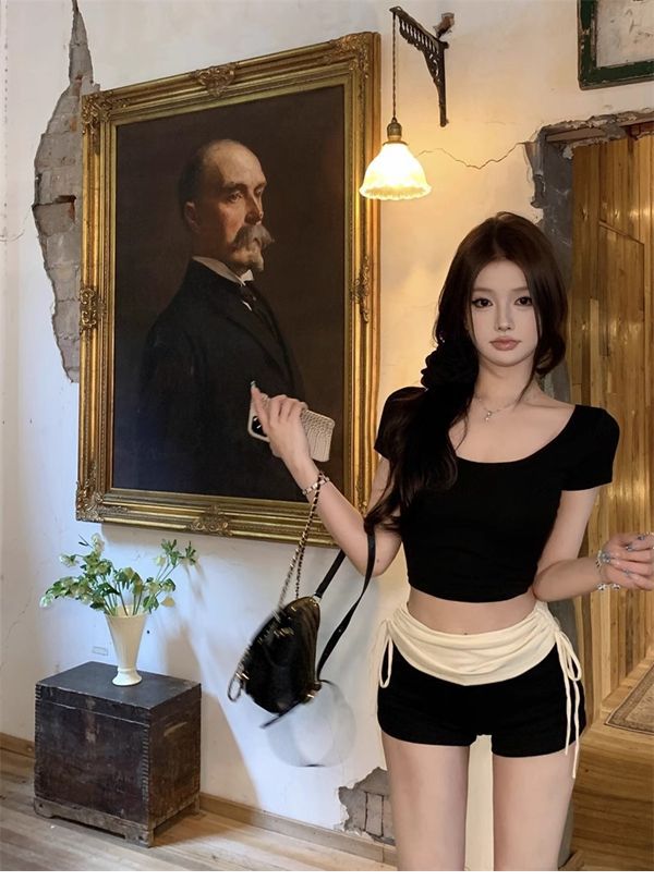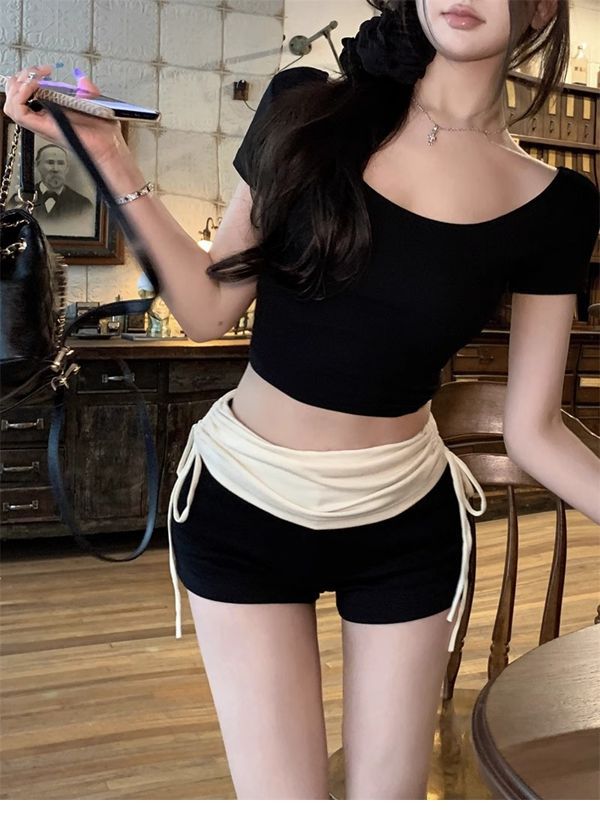 ホットガールレイジータイトフィットスリムカラー半袖Tシャツ夏のショートトップ巾着ショーツスーツ