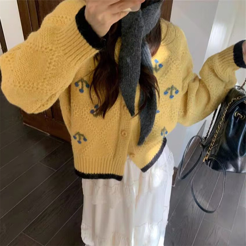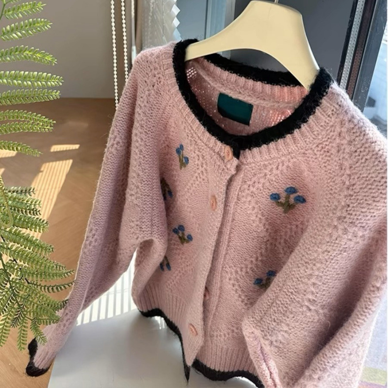 フレンチコントラストカラーフラワーニットセーターカーディガンアウターレディースルーズデザイン外国風年齢軽減万能セーター女性秋冬