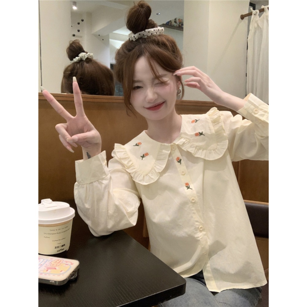 2025法式甜美刺绣娃娃领长袖衬衫女早秋新款设计感小众学院风上衣