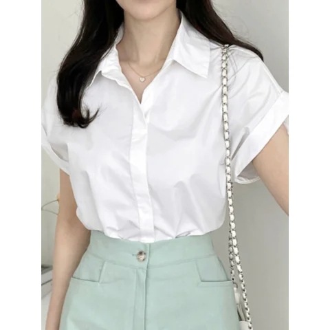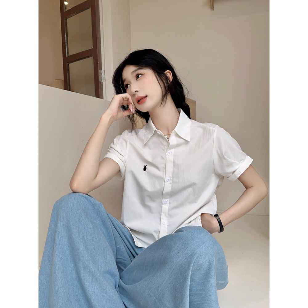 ウサギ刺繍半袖シャツ女性の夏の 2025 新しい韓国スタイルルーズカジュアルシングルブレストラペルトップシック