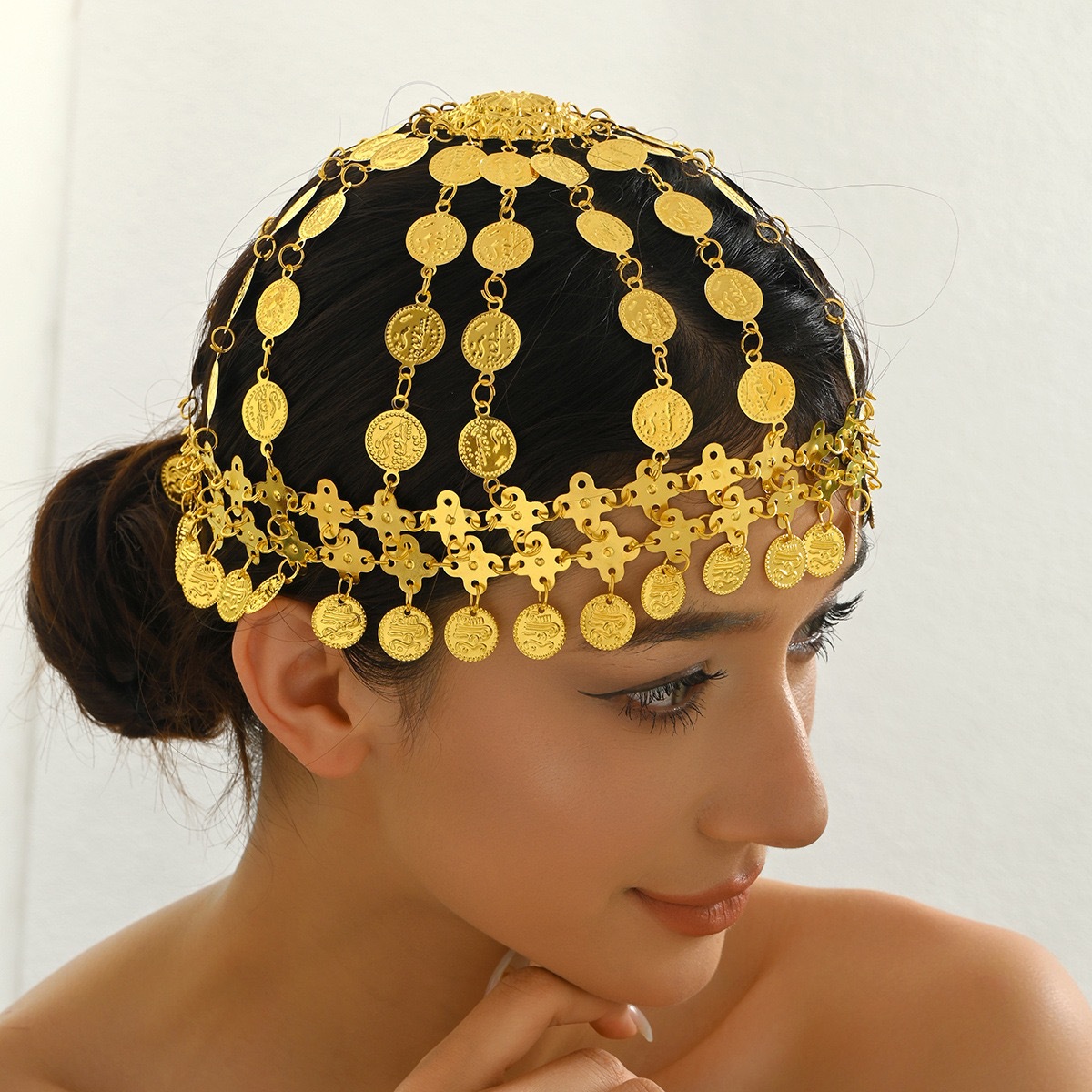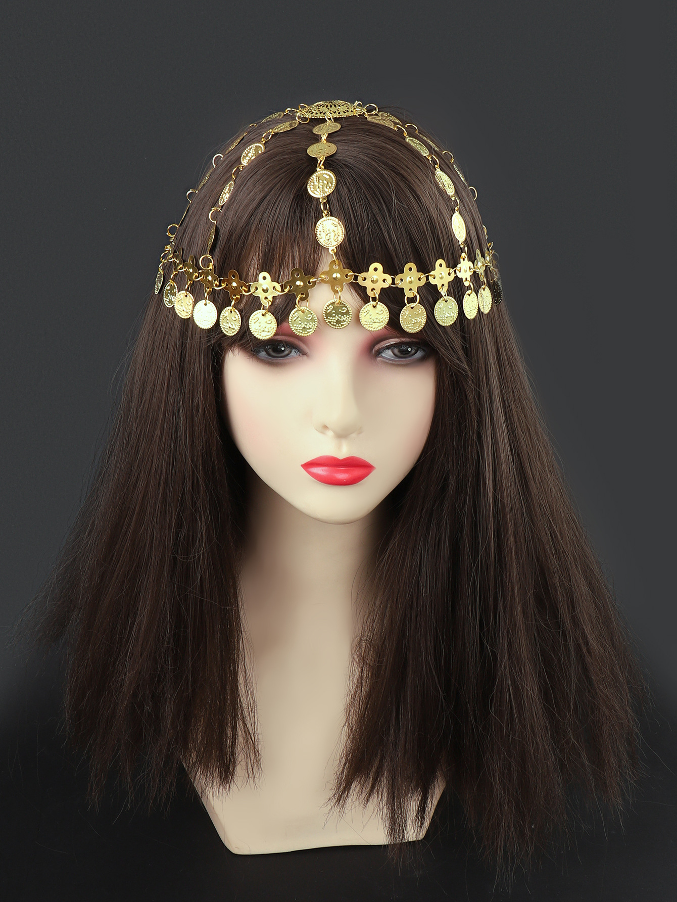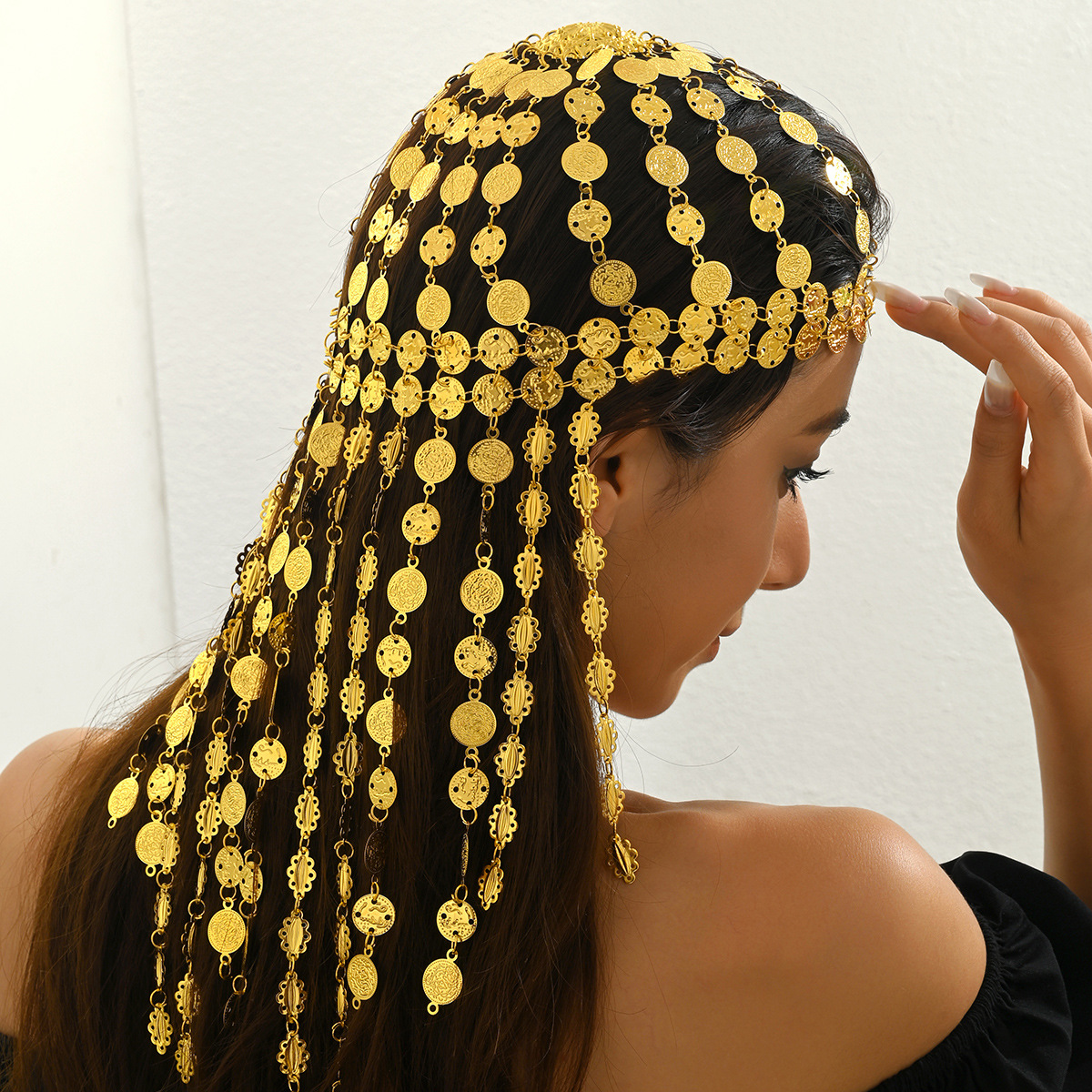 中古風アラビアの頭飾り、中東と欧米で人気の金色合金コインタッセル付きヘアチェーン