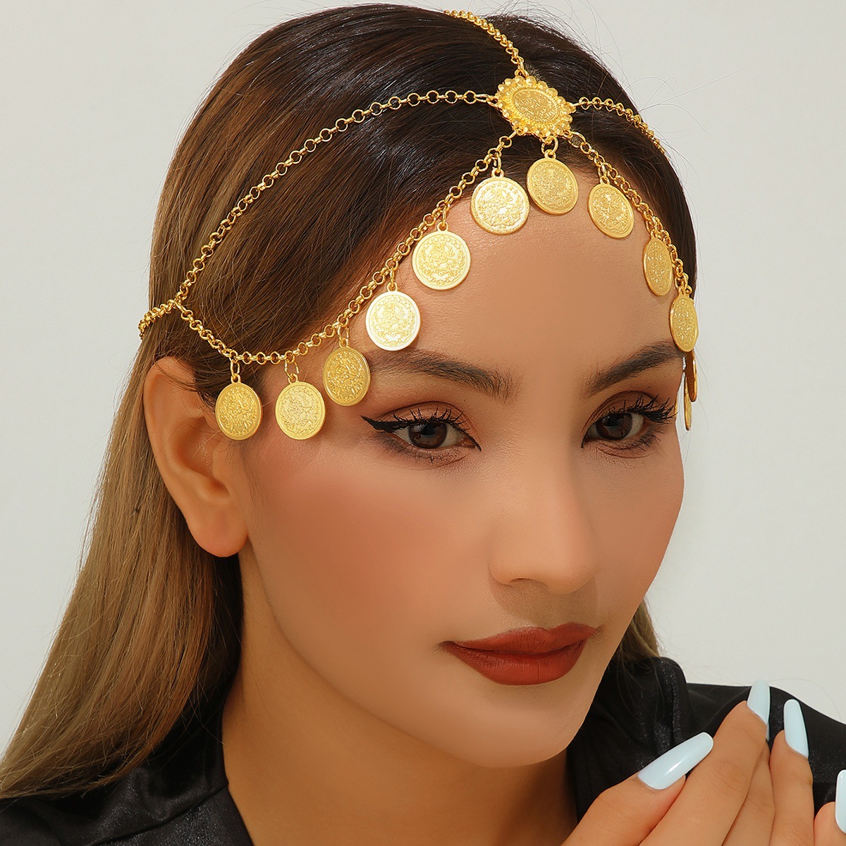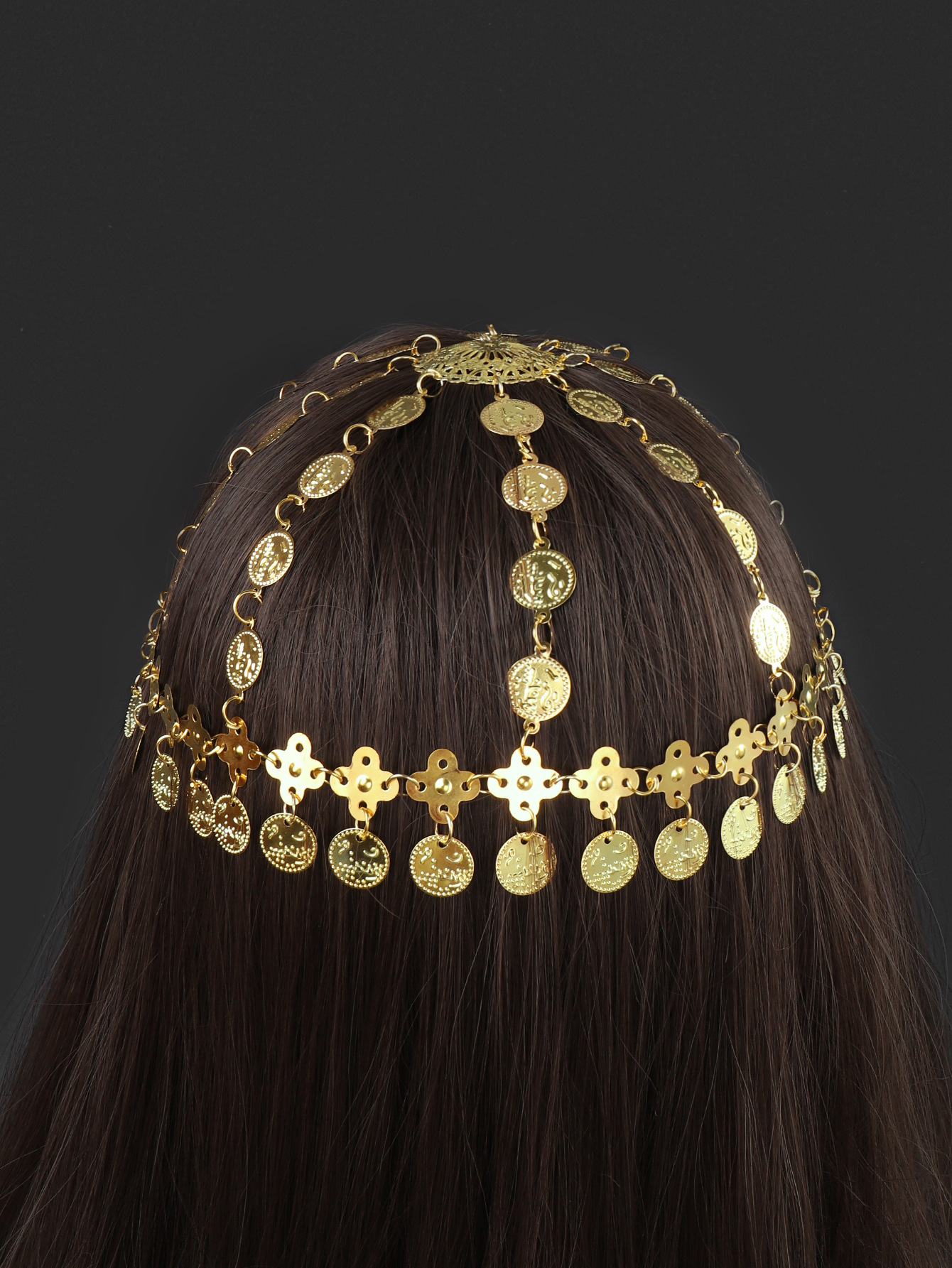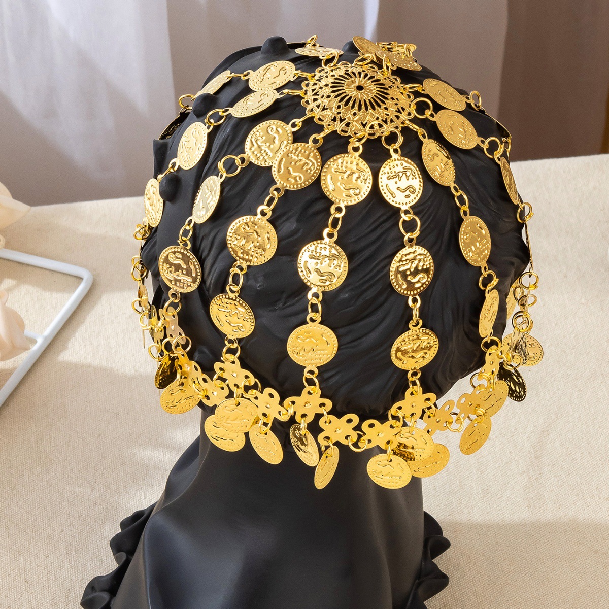 中古風アラビアの頭飾り、中東と欧米で人気の金色合金コインタッセル付きヘアチェーン