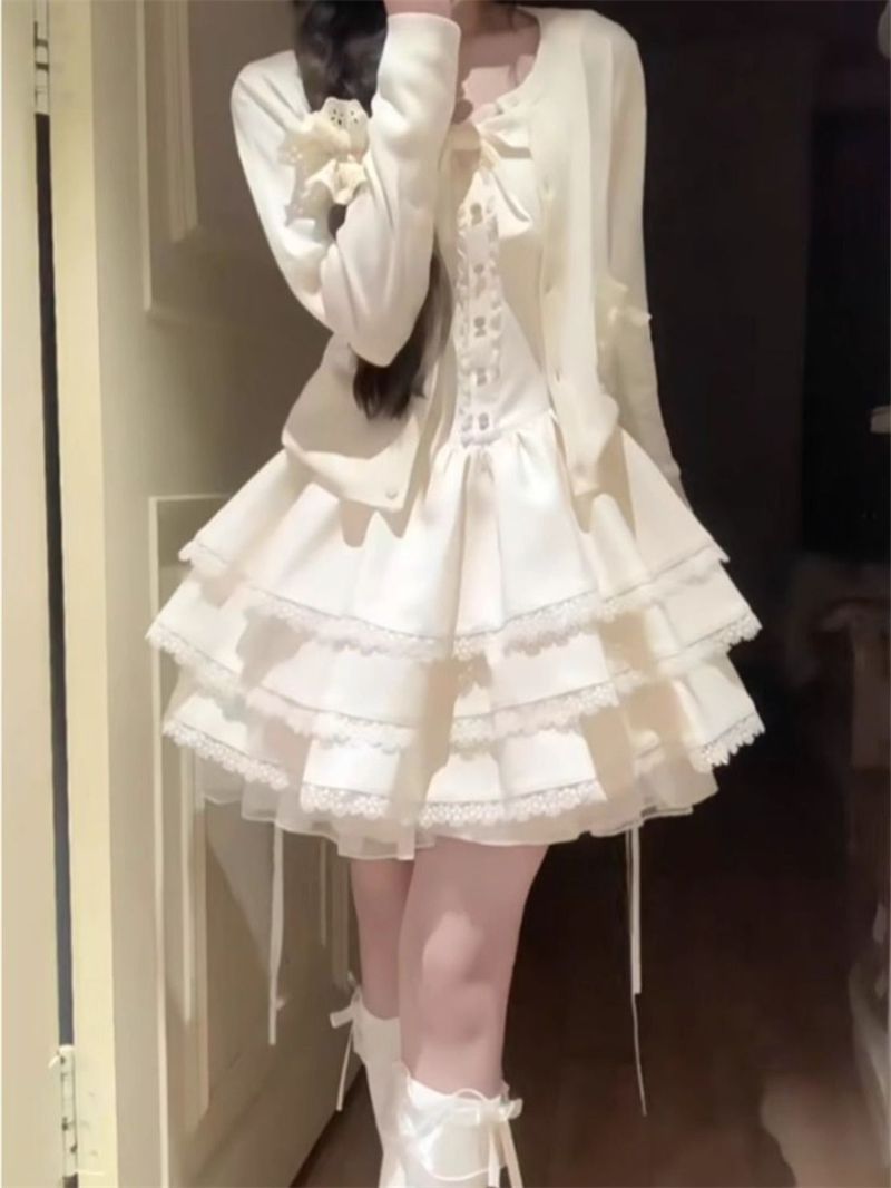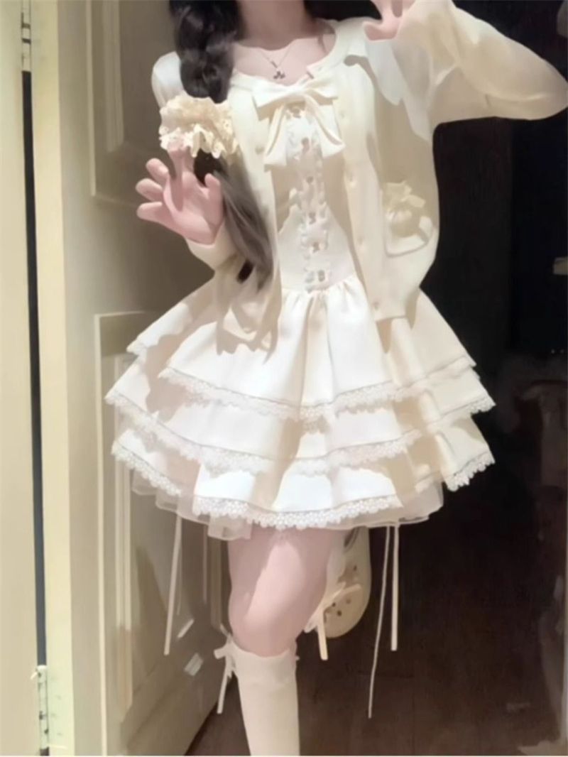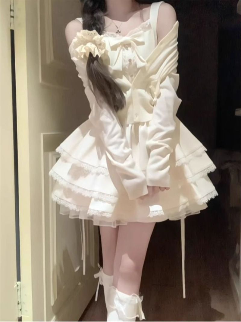 小柄な方向けの夏のピュアセクシーサスペンダーケーキドレス+アプリコットカーディガン日焼け止め2点セット