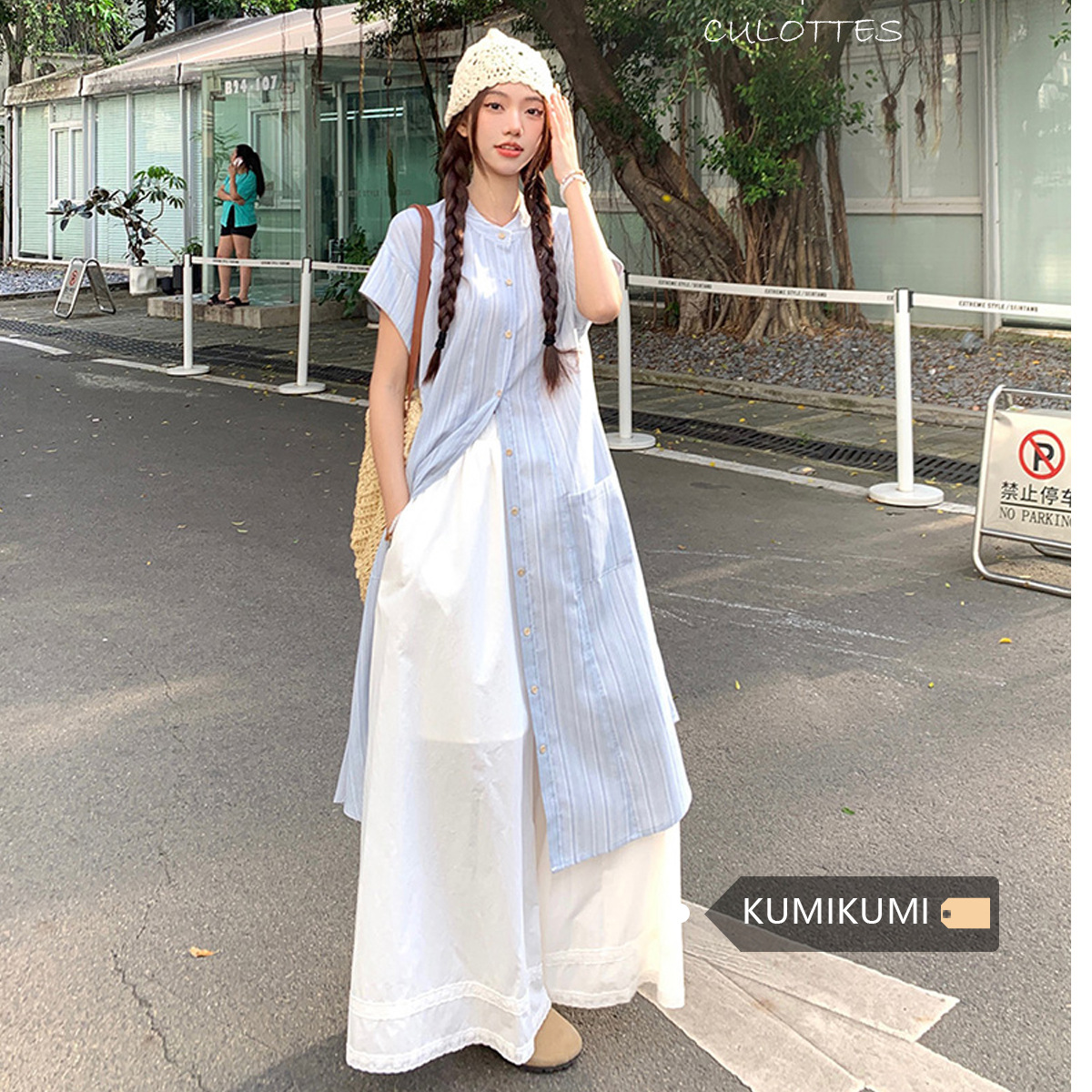 大きいサイズの日系の甘い重ね着のスーツの女性の夏2025新型のストライプのシャツのワンピースのワイドレギンスのスカートの2つのセット