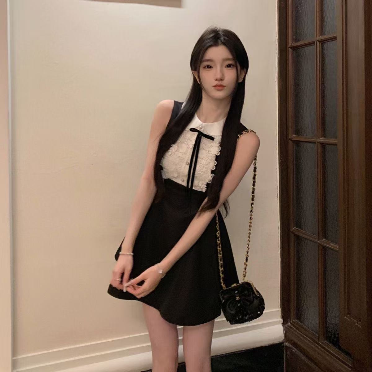 スプライスレースドール2025夏気質スリムドレスフレンチダウジンノースリーブAラインスカートウエストショートスカート