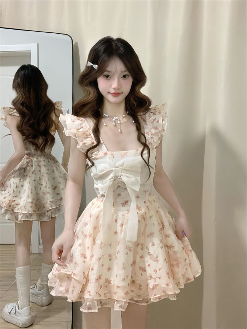 フランスの甘い花のストラップのワンピースの女性の夏の小さい背は腰のデザイン感の花のつぼみの蓬の王女のショートスカートを収めます。