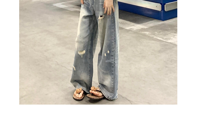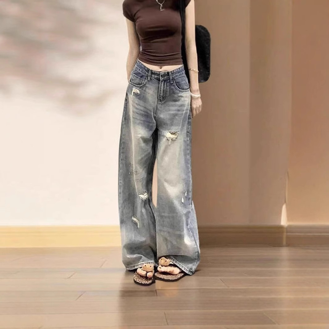 夏の女性用アメリカンスタイルのリップドワイドレッグジーンズ、スリムで小柄な人向けの新しいスタイル、ゆったりとしたハイウエストのストレートレッグ、多用途のフロアレングスパンツ