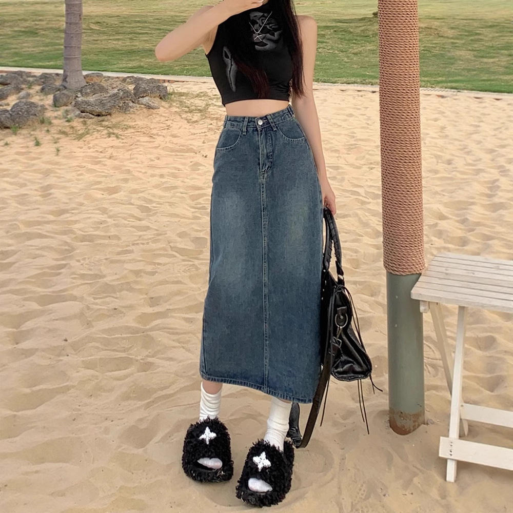 女性のためのハイウエストスリットデニムスカート 2025 新しい夏の小さな A ラインスカートレトロヒップカバーロングスカート
