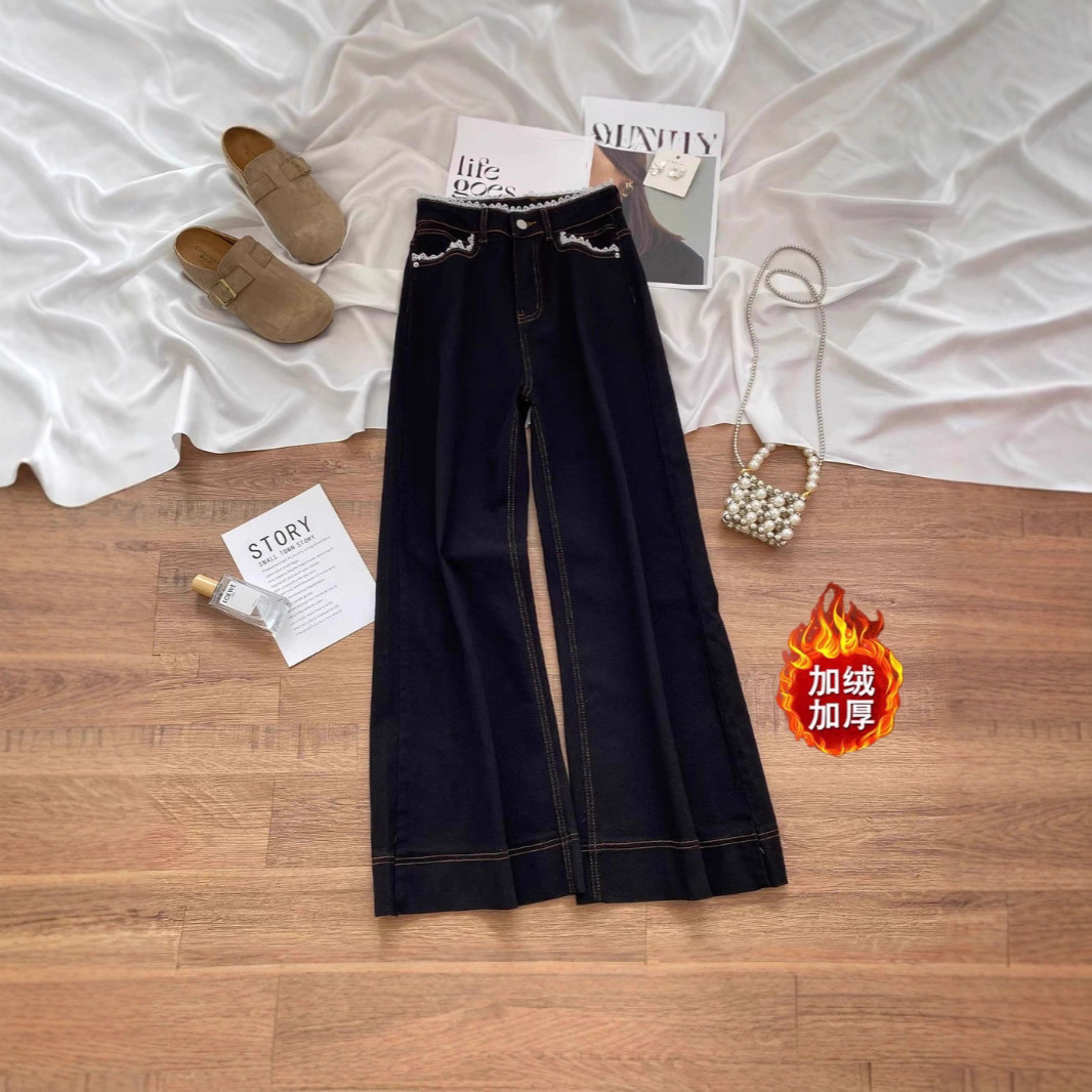 加绒加厚黑色阔腿蕾丝牛仔裤春夏高腰新款宽松显瘦不贴花边喇叭裤