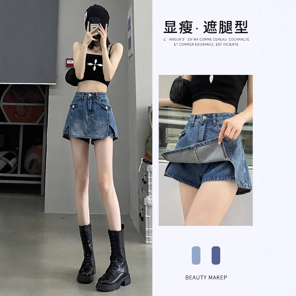 开叉牛仔短裤裙裤女春夏季薄款2025新款高腰辣妹小个子a字短裙子