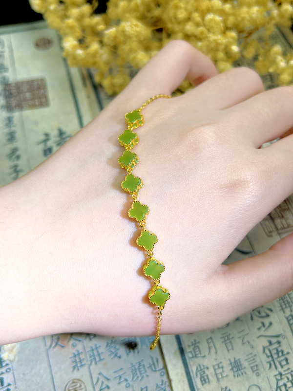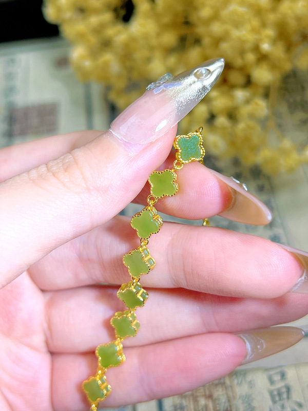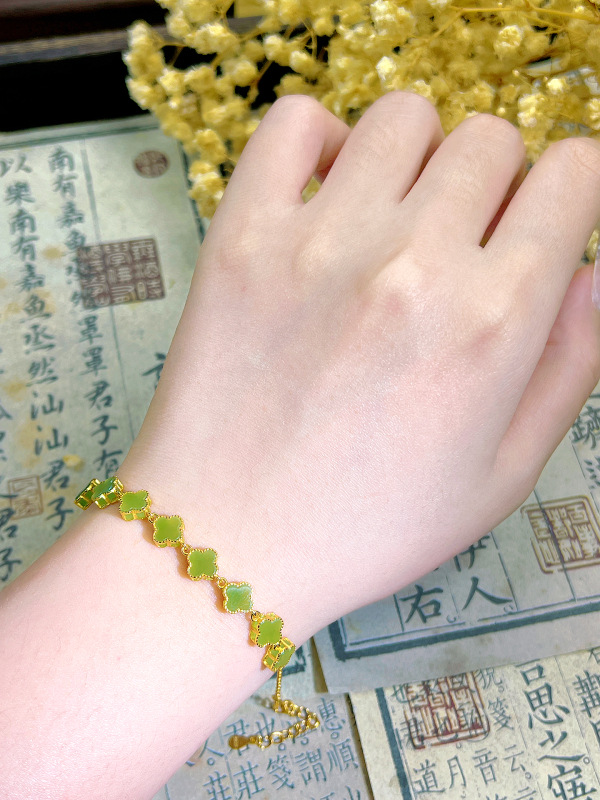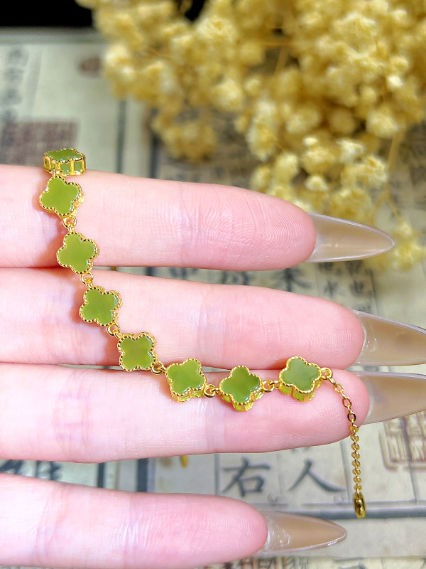 S925 シルバー象嵌天然ホータン碧玉クローバーブレスレットファッション絶妙な女性ジュエリー