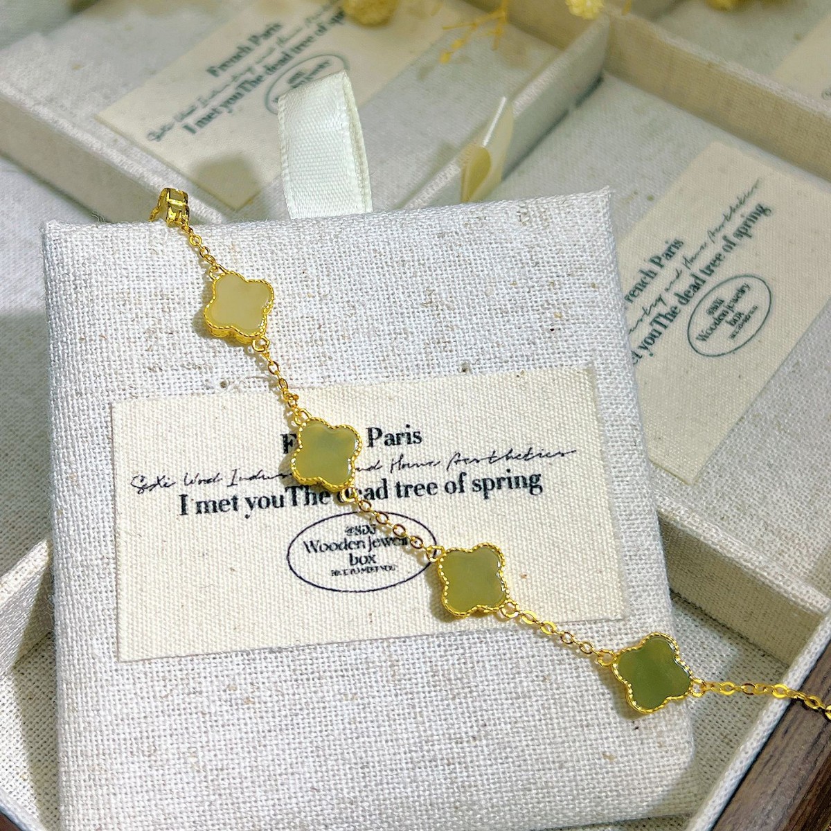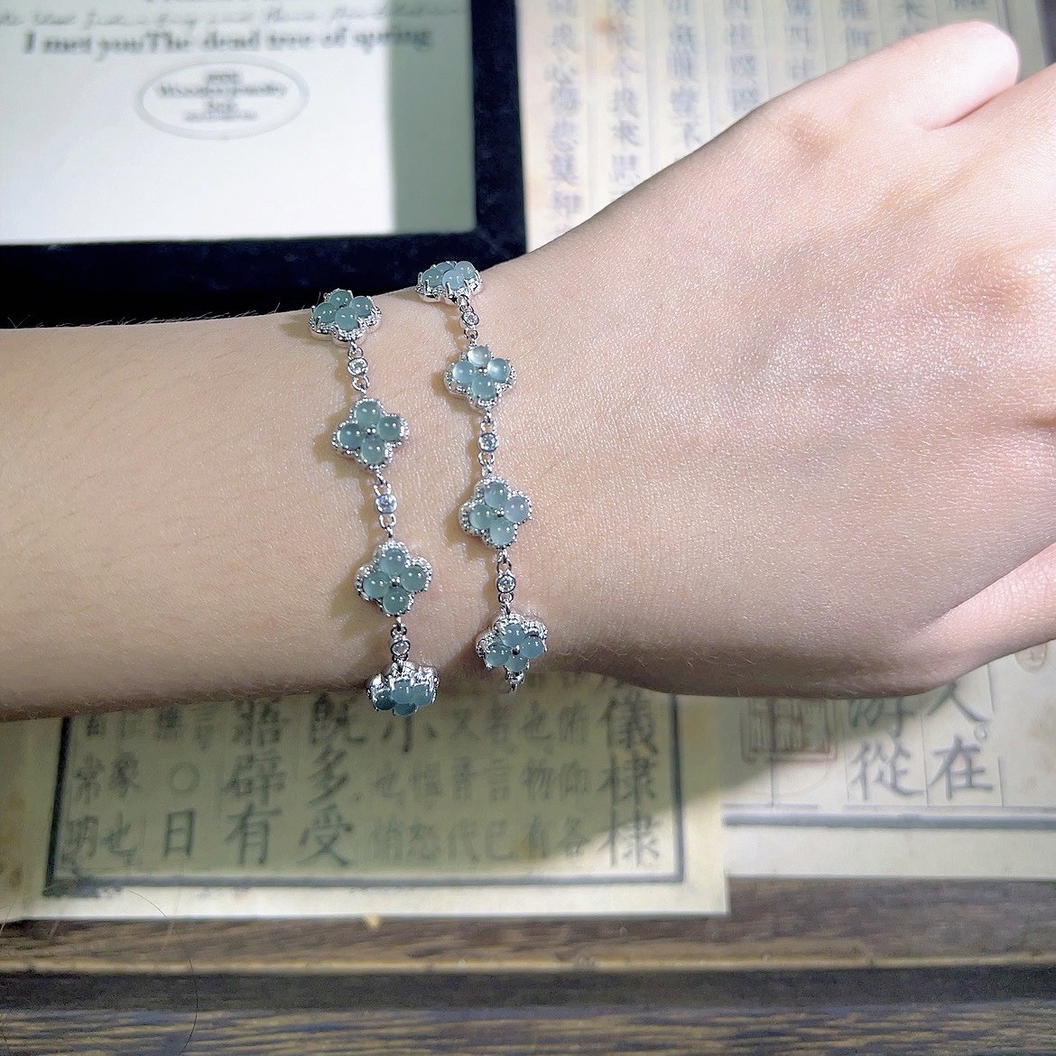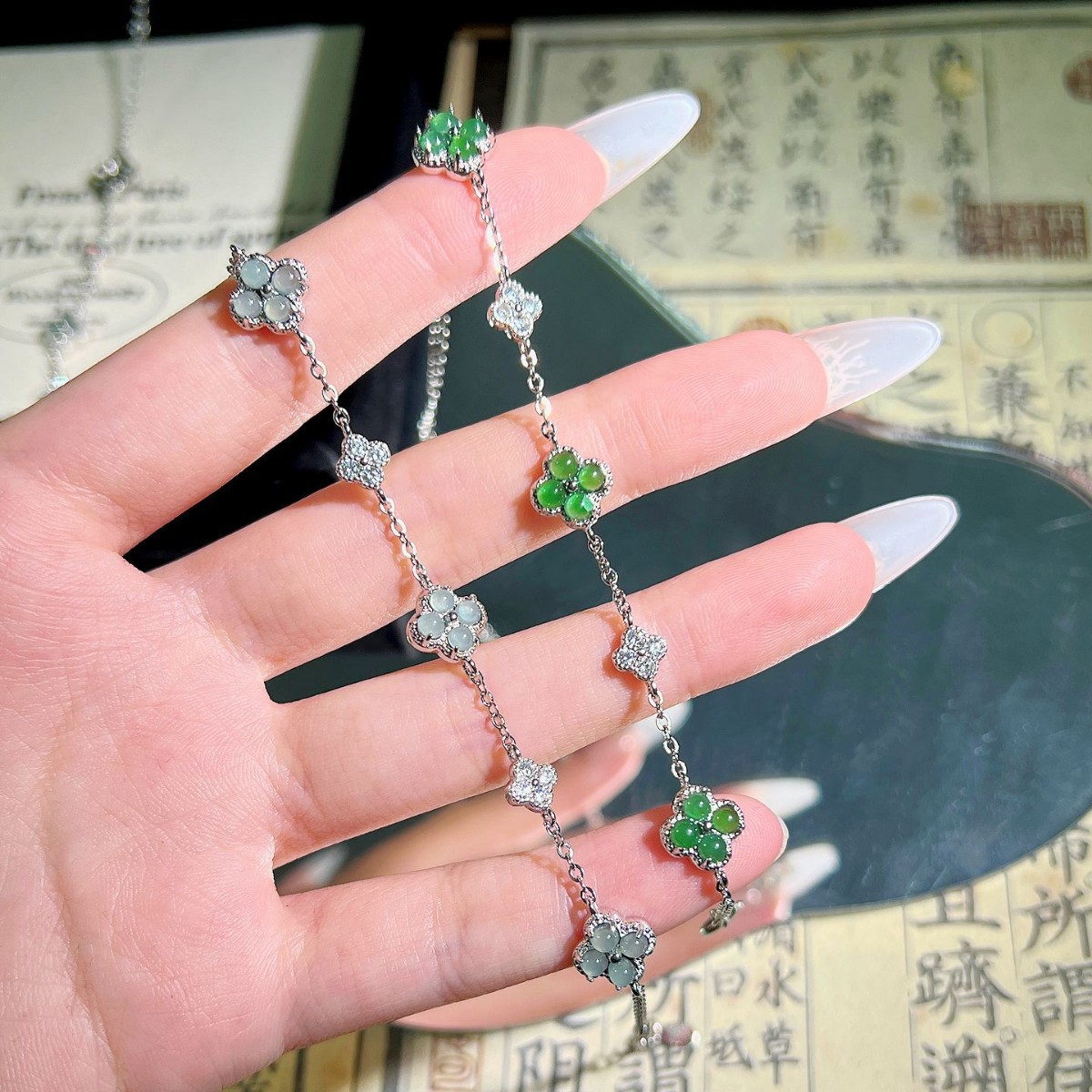 メーカー卸売り天然和田玉碧玉四つ葉草ブレスレットS925銀モザイク