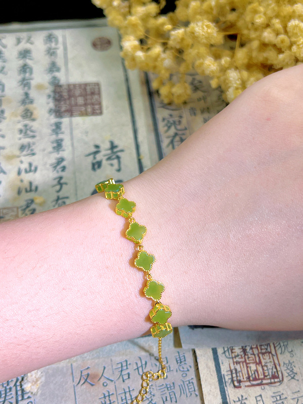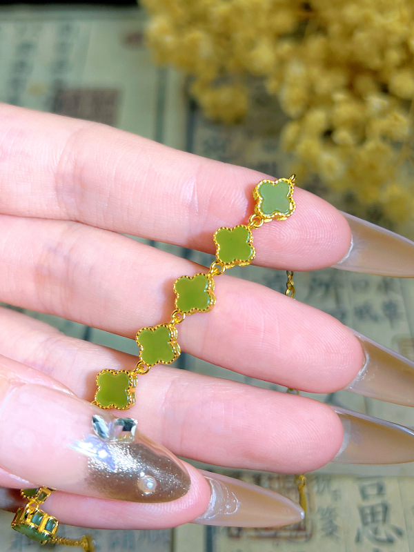 天然ホータン翡翠ジャスパーブレスレット S925 スターリングシルバー四つ葉のクローバー花翡翠象嵌新中国風の人気ジュエリー卸売