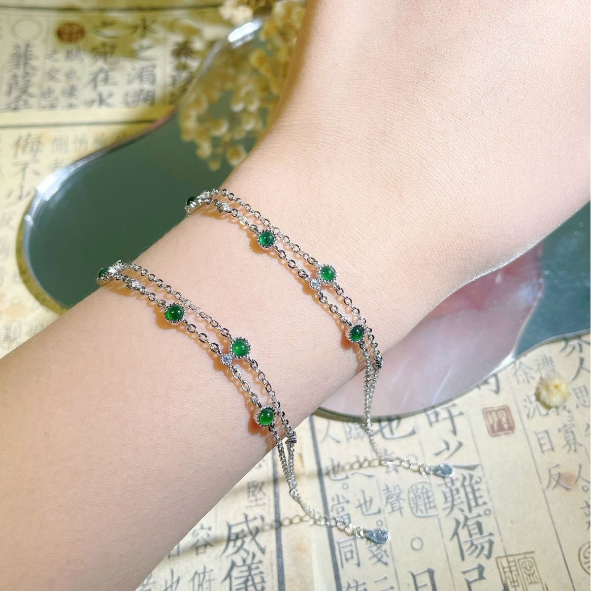 重工高級満ドリル天然陽緑翡翠モザイク二列女性軽贅沢ファッション新中国式ブレスレット百合アクセサリー