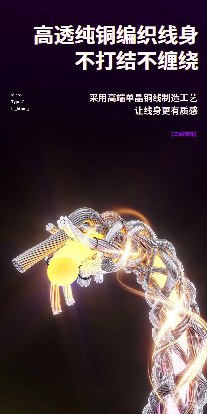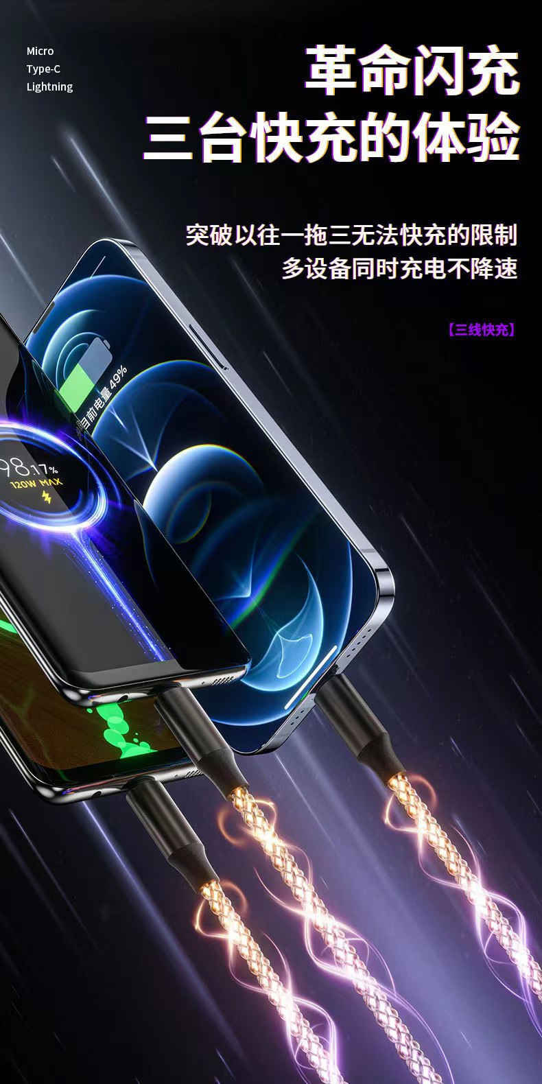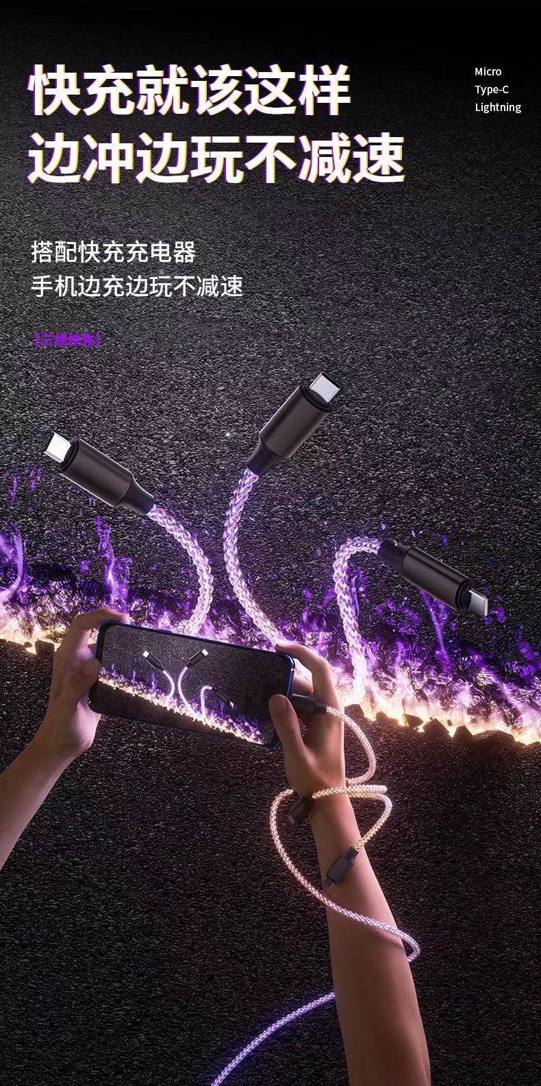 RGB三合一充電ケーブルデータケーブルは、Apple TYPE-Cに適しており、三つに分かれて光を流し、流れるような光で急速充電を実現し、車載にも対応します。