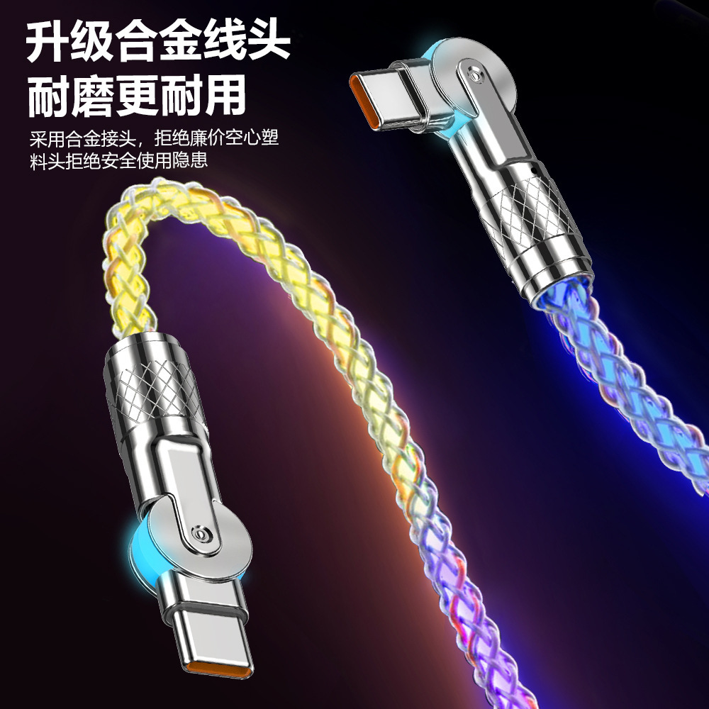 RGBカラフル亜鉛合金フラッシュ充電回転エルボ携帯電話データケーブル66W超速充車載グラデーション発光線