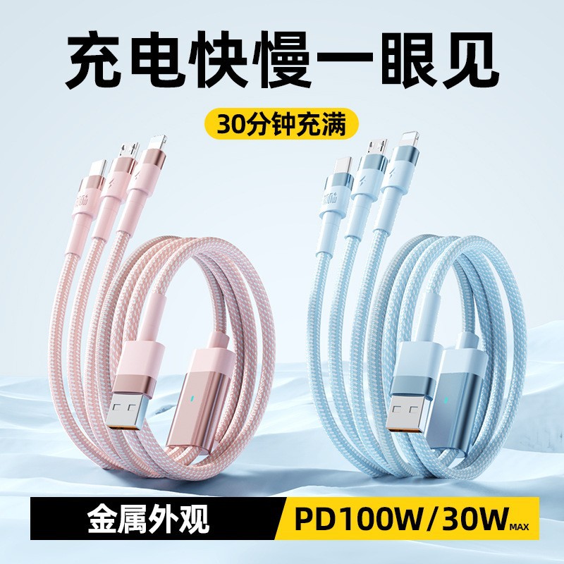 Apple 16 Huawei Xiaomi 1対3データケーブルType-Cに適したライト付き100Wスリーインワン超高速充電ケーブル
