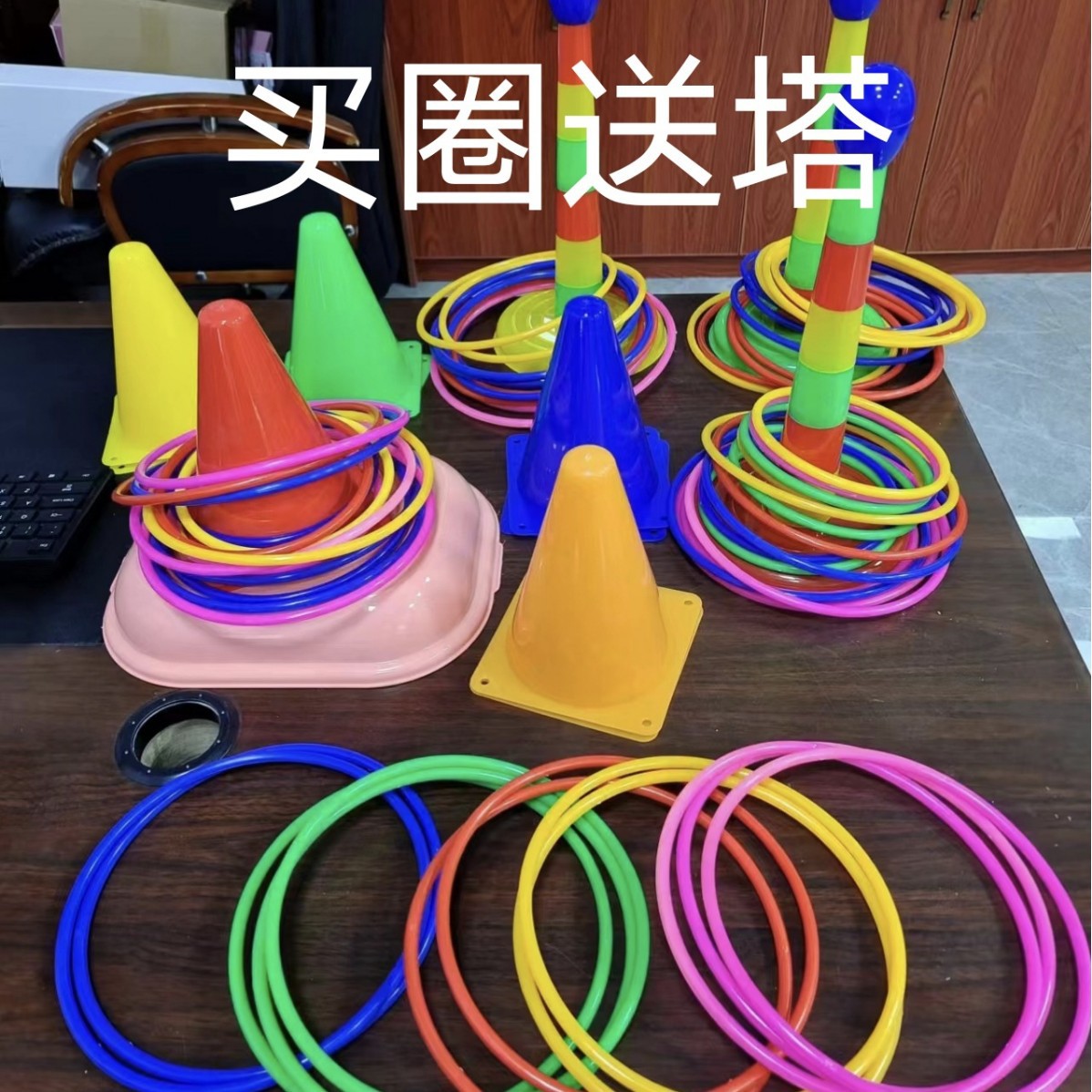 子供の夜市は輪投げをします。プラスチックの輪投げのおもちゃの輪投げです。
