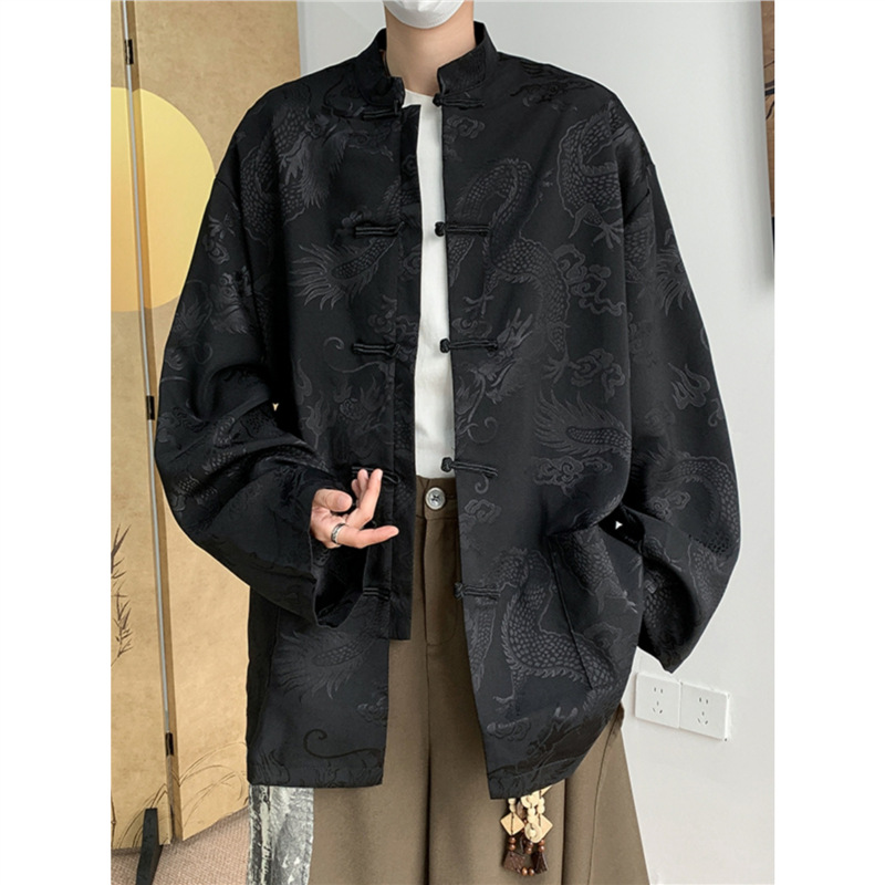 新しい中国風のドラゴンパターンボタン唐スーツシャツメンズ中国風のハイエンドトレンディなブランドルーズアイスシルクカジュアルスタンドカラーシャツ