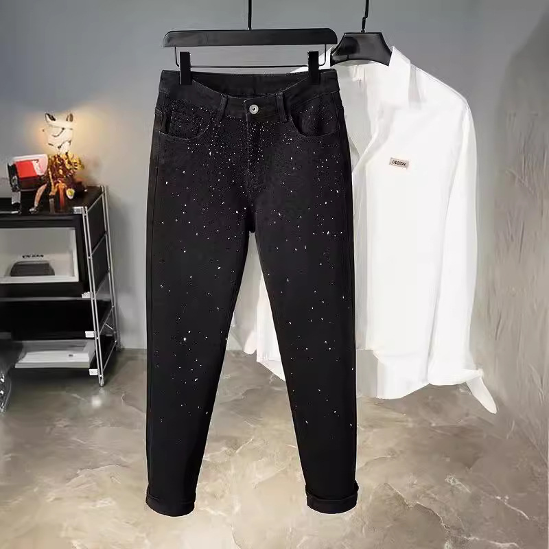 ホットダイヤモンドブラックジーンズメンズスリムフィット2025新作夏トレンディブランドカジュアル薄いベビーブレスパンツ