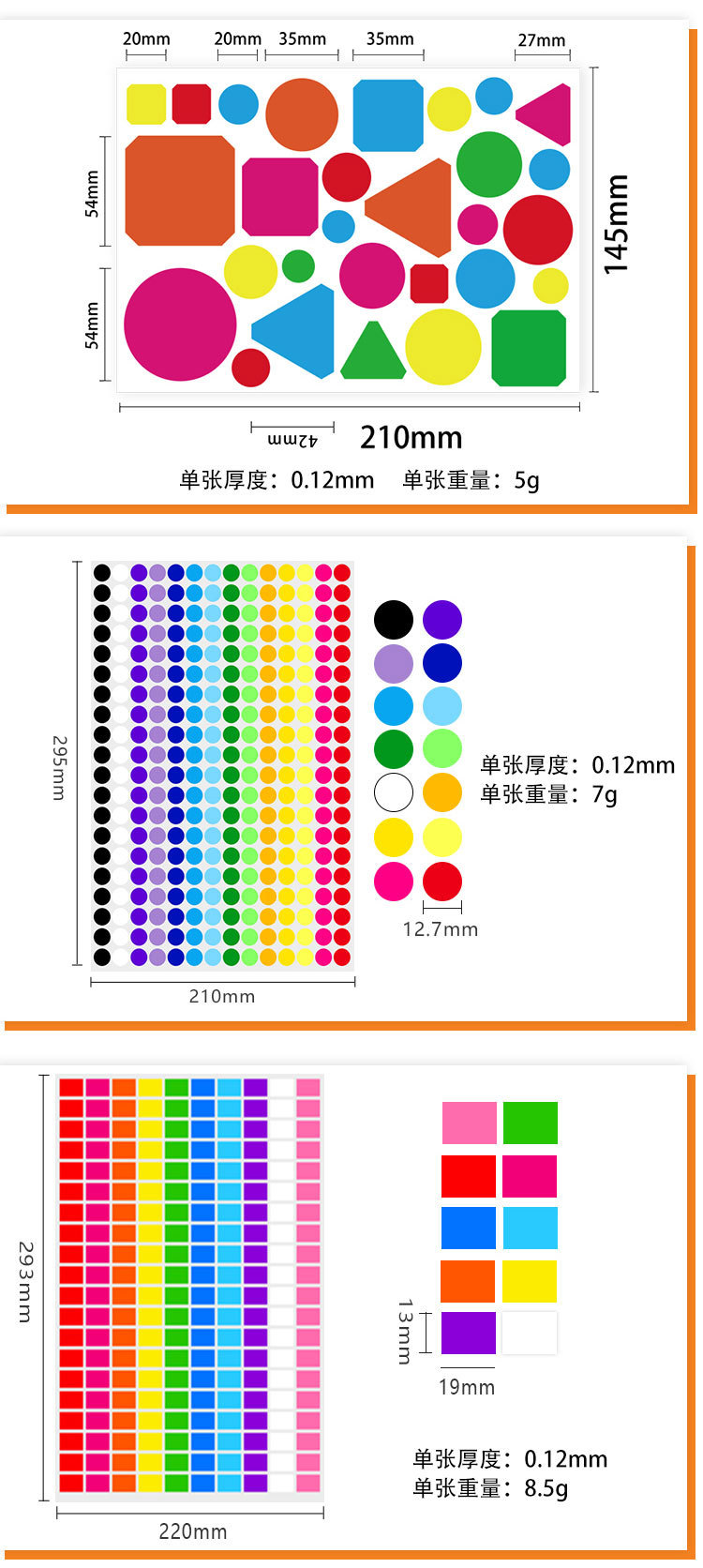 6mm 10色(550枚/シート),12.7mm 14色(280枚/シート),12mm 10色(120枚/シート),15mm 5色(96本/シート),25mmタイプA 7色(70枚/シート),25mmタイプB 7色(70枚/シート),25mmCモデル 10色(70枚/シート),25mmDモデル 10色(70枚/シート),30mmタイプA 4色(24枚/シート),30mm Bスタイル 10色(70枚/シート),カスタマイズをサポート