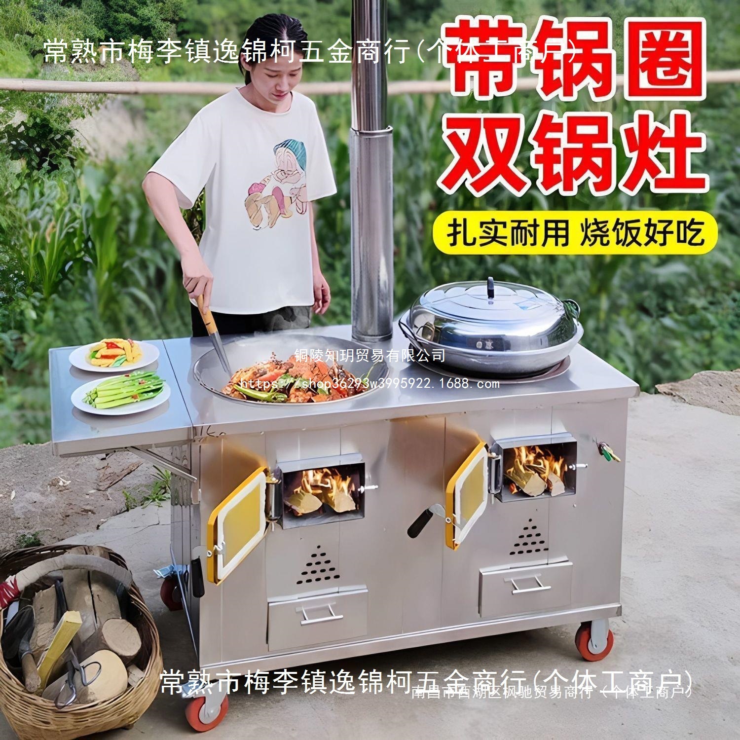 不锈钢柴火灶户外移动大锅台农村柴火炉家用新式大铁锅无烟双锅灶