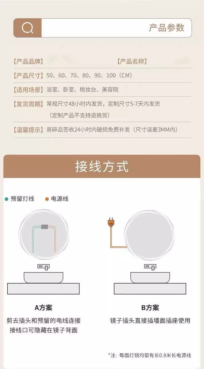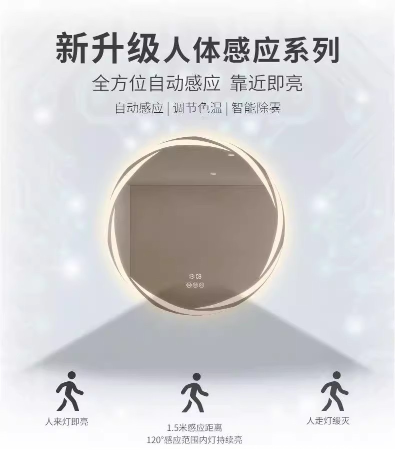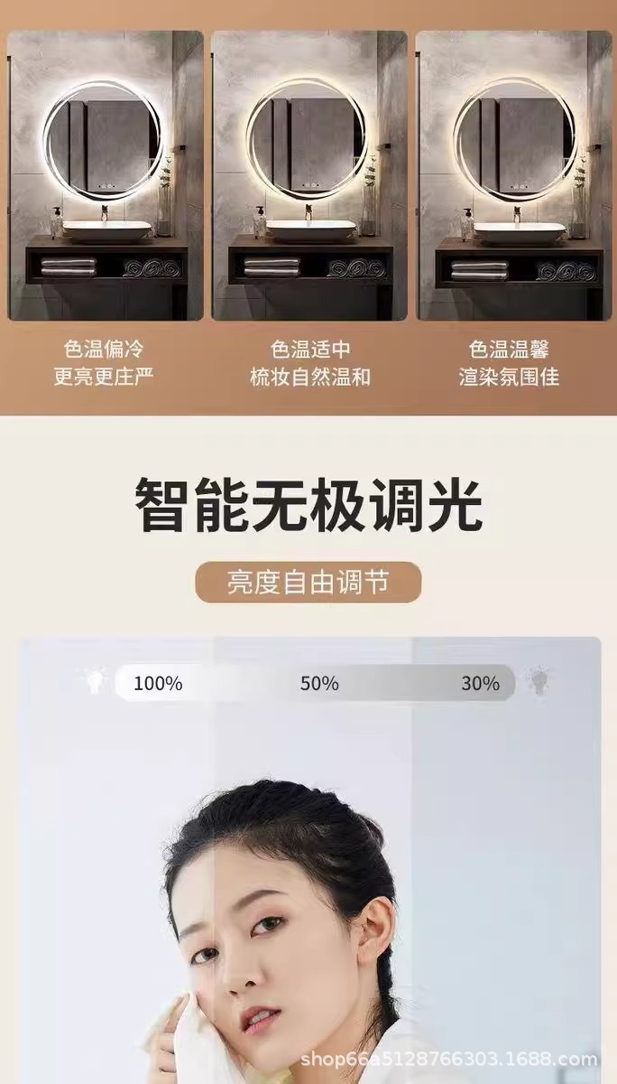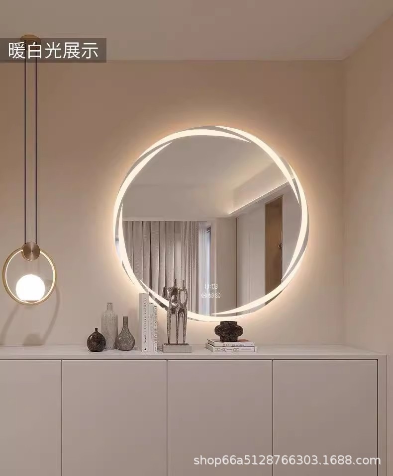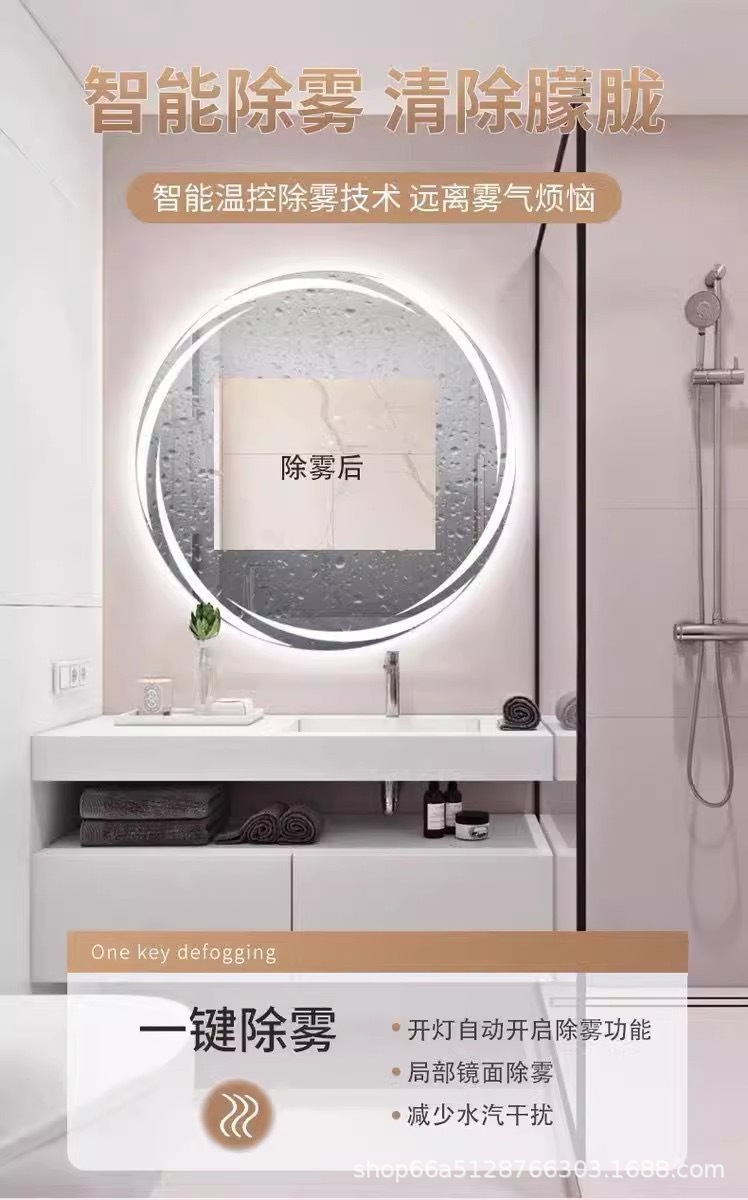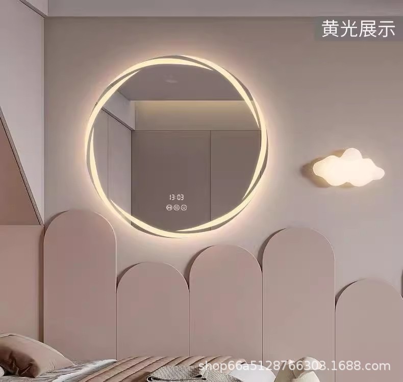 スマート円鏡枠付きledランプ浴室鏡防曇タッチパネルトイレ化粧浴室鏡穴なし壁掛け