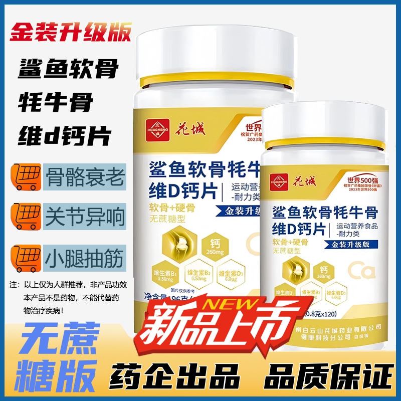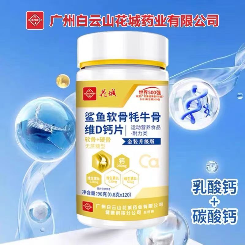 白云山花城鲨鱼软骨牦牛骨维D钙片无蔗糖乳酸钙碳酸钙中老年代发