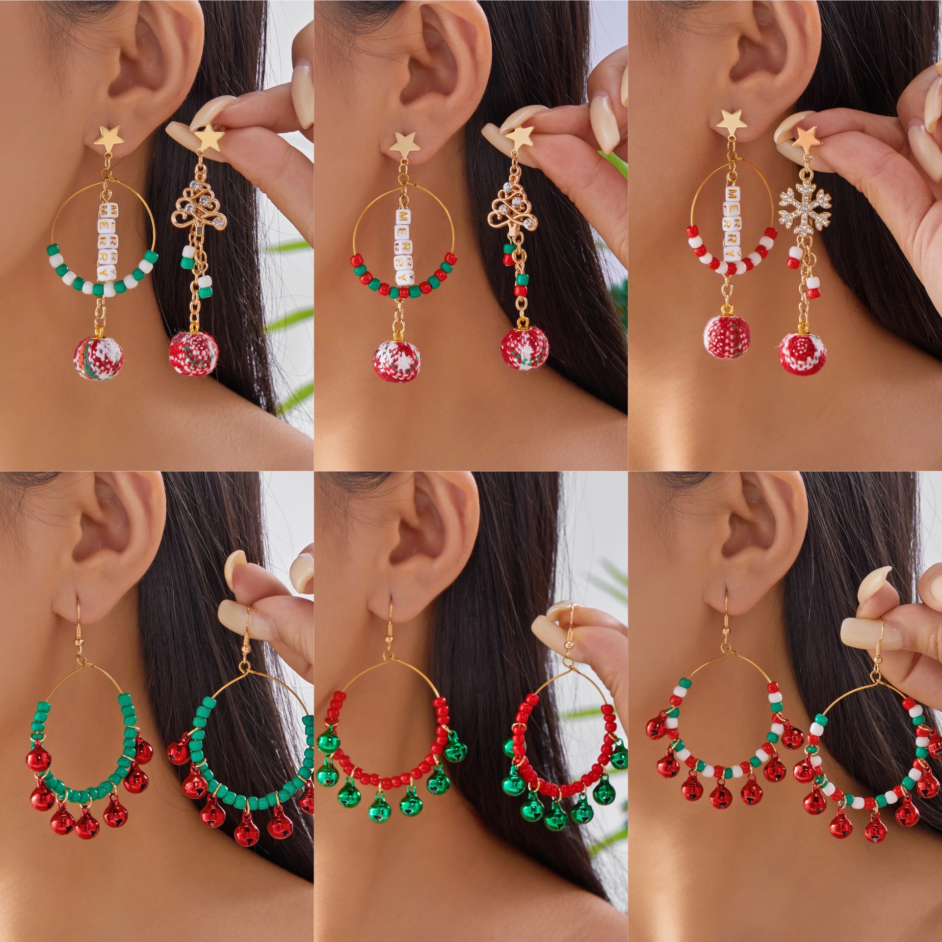 圣诞系列耳环 撞色米珠铃铛流苏耳环节日礼物女士圣诞节派对耳饰