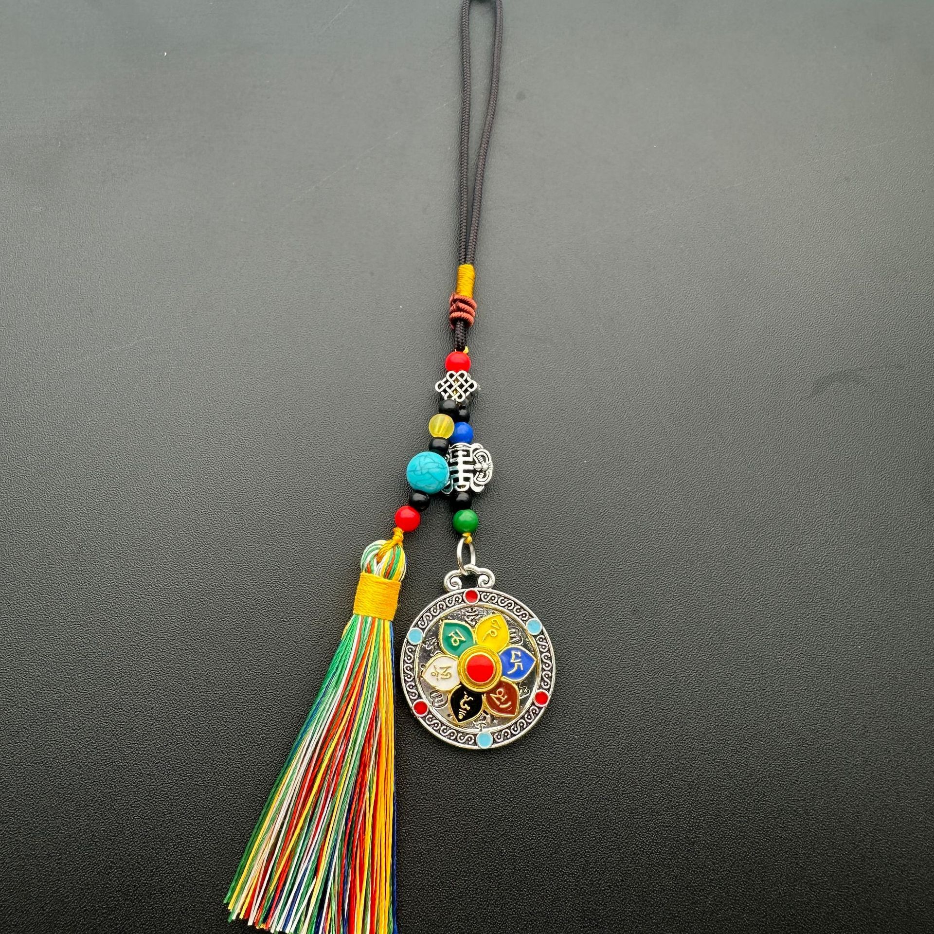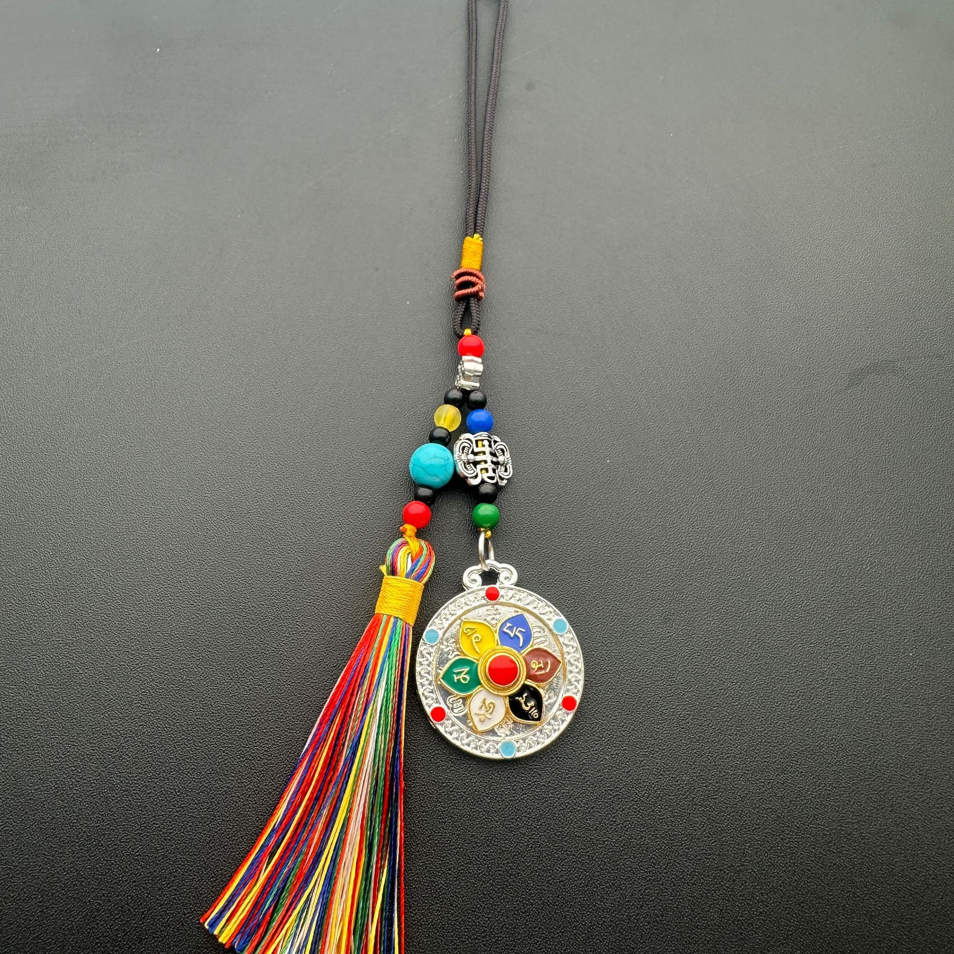 チベット式の六字真言と五彩のタッセルが付いた仏教のお守り、合金製の禅意ある車用装飾品