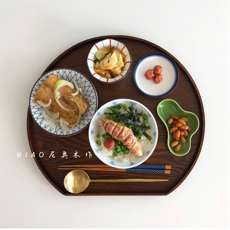 木质日式托盘家用托盘餐具套装一人食不规则圆形托盘早餐盘