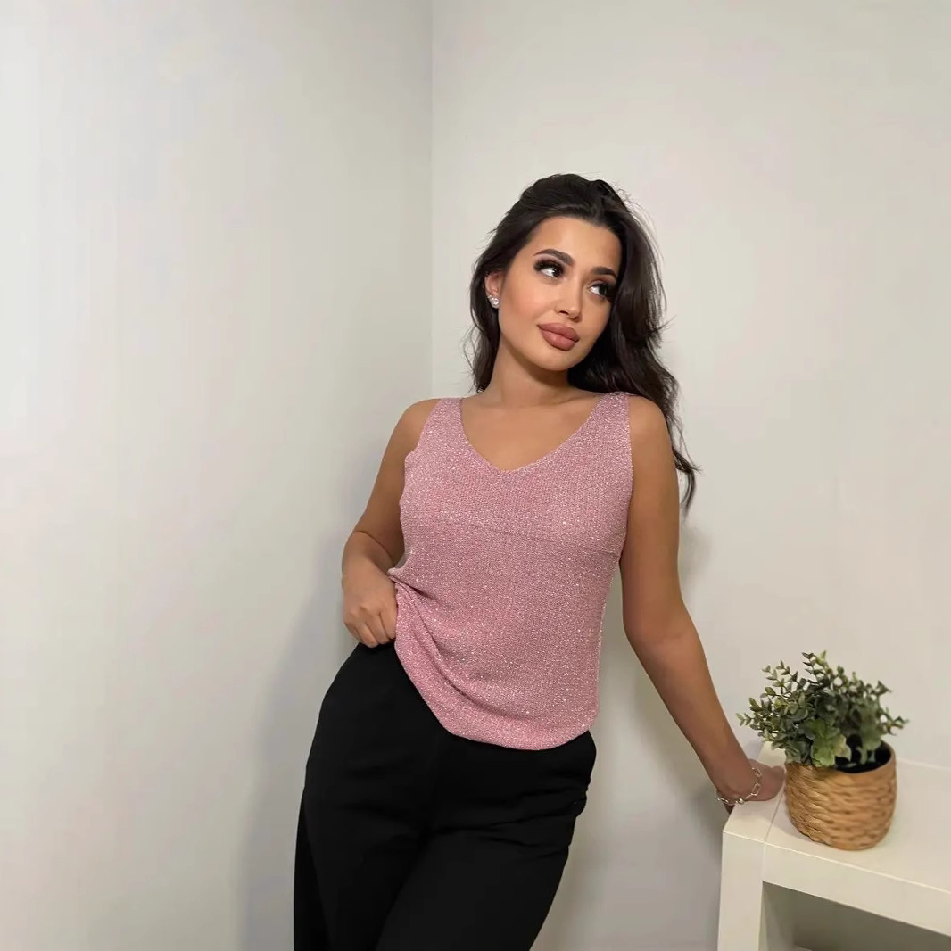 2023年ホットな光沢のあるノースリーブベスト、女性用春夏Vネックゆったりヘビーデューティーラインストーン付きニットキャミソール、外でも着用可能