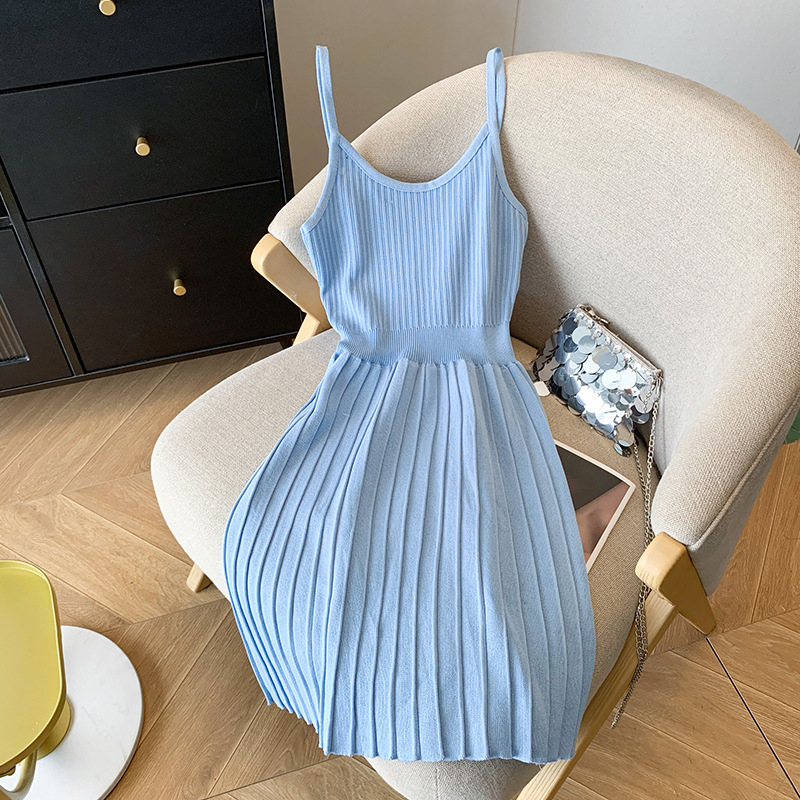 実写スポット夏新作純色甘ギャル純欲風サスペンダースカートニットワンピース