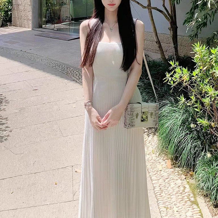 初恋白月光白ロングスカート淑女気質優しいスタイル社交界の娘ニットサスペンダードレス