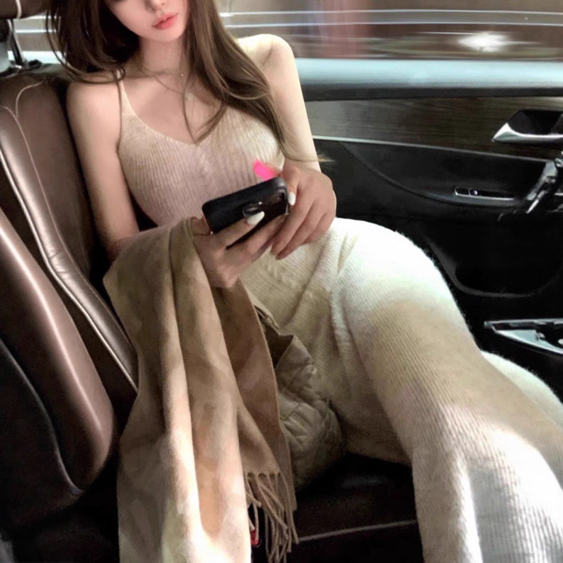 【清冷酒杯】秋季新款长羊驼毛针织吊带连衣裙女修身包臀长裙秋
