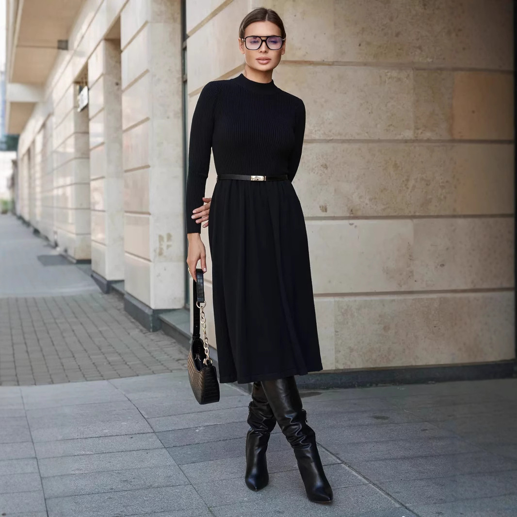 高級感の優雅なニットのワンピースのストラップの長いスカートの女性の中で身を修めるのはやせています。