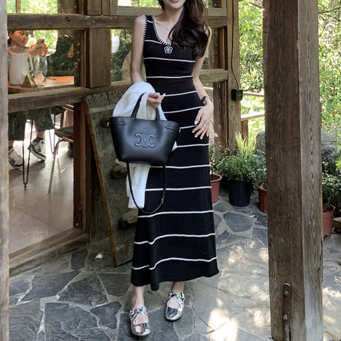 撞色山茶花吊带连衣裙2025夏季新款气质条纹无袖背心显瘦遮胯裙子