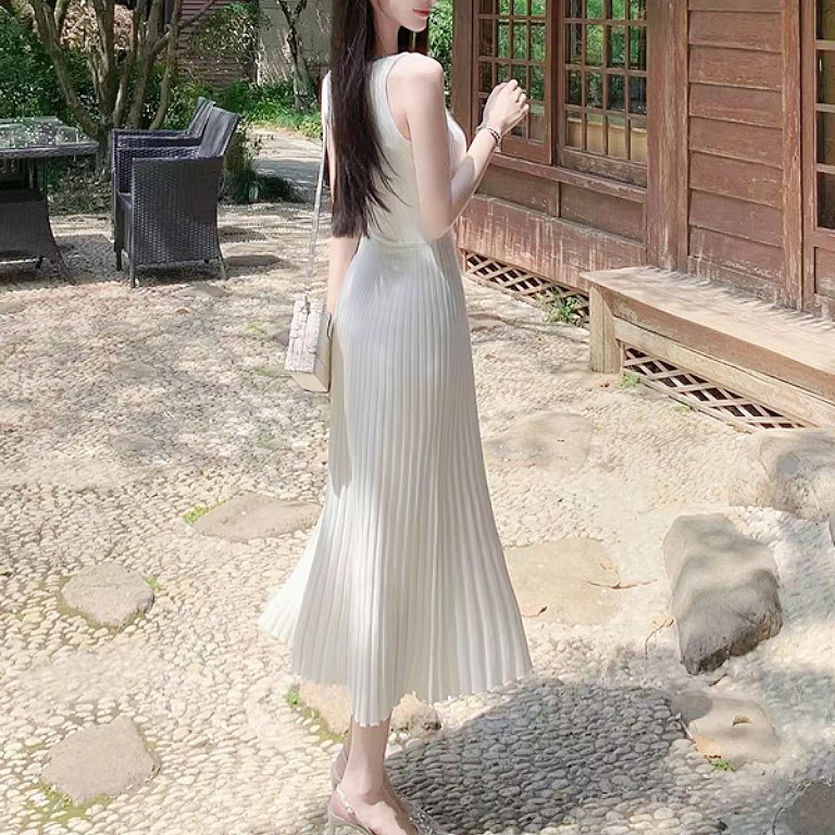 2025法式夏季新款两色收腰显瘦无袖内搭打底针织裙百褶长款连衣裙