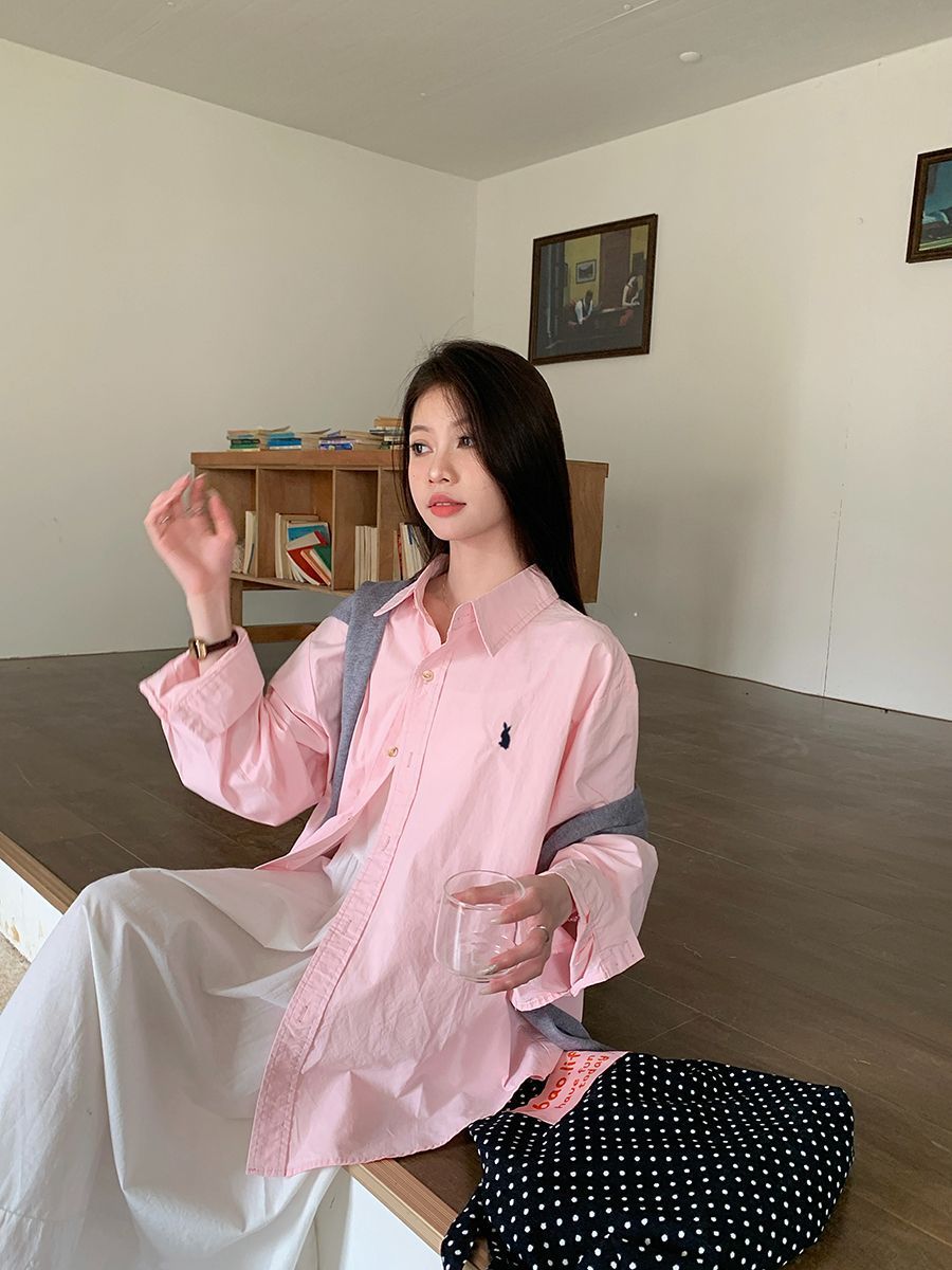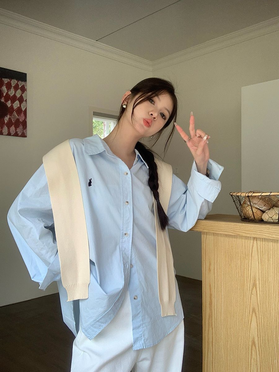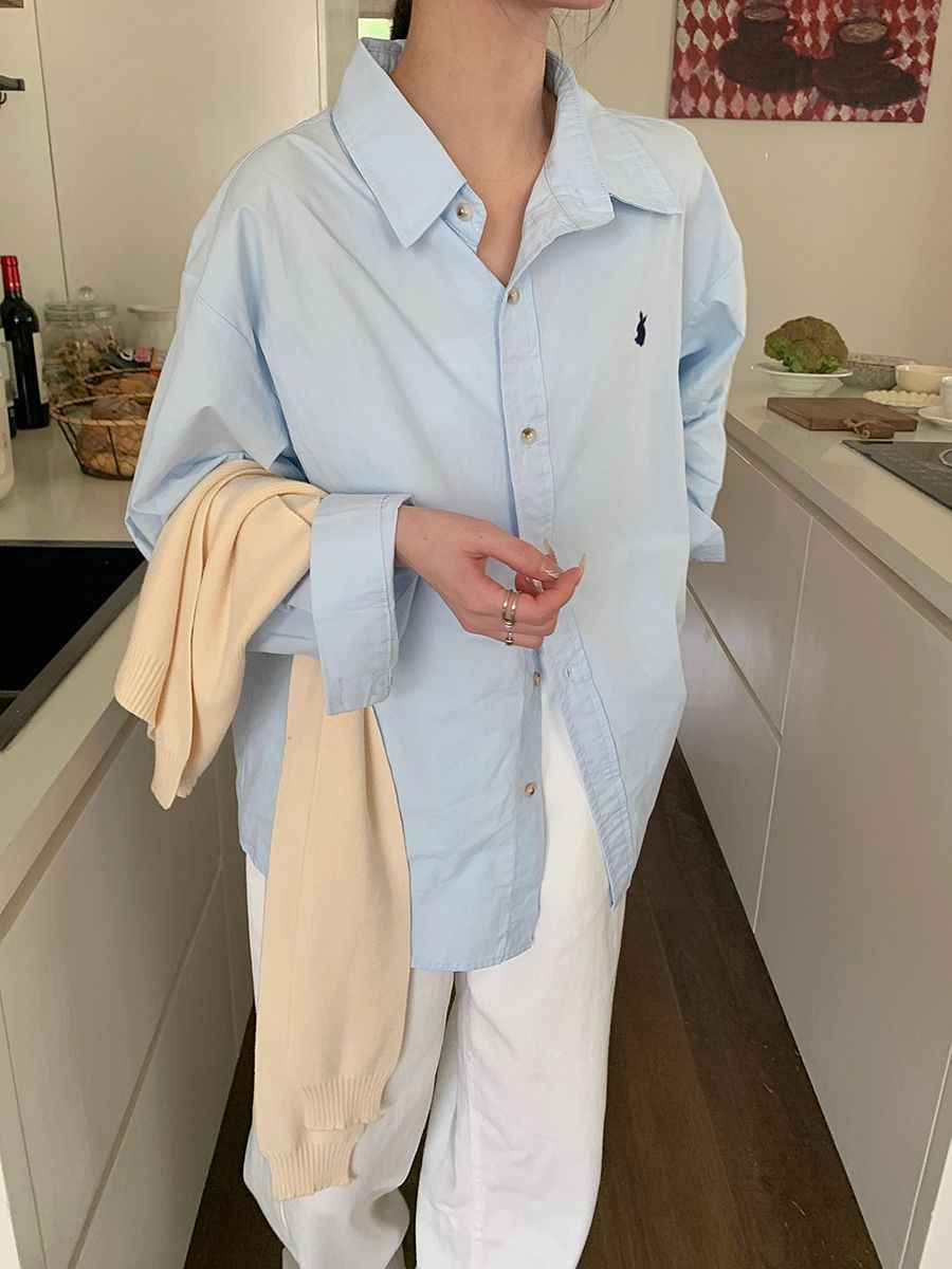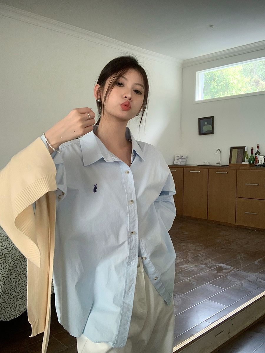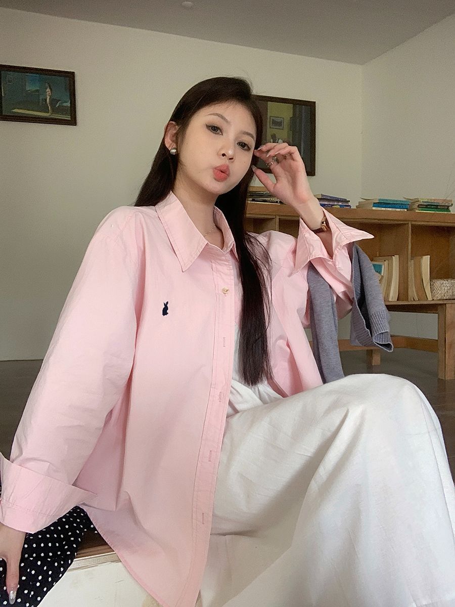韓国ポロカラーシャツ春の新作無地カジュアルカップル気質長袖トップウサギ刺繍多用途