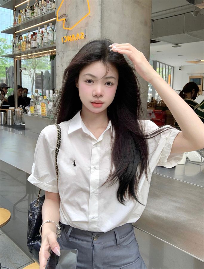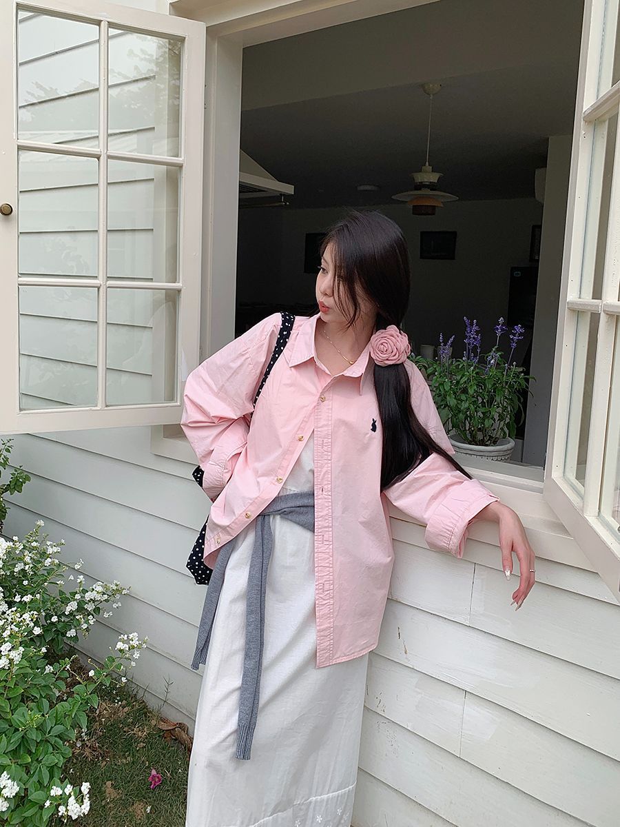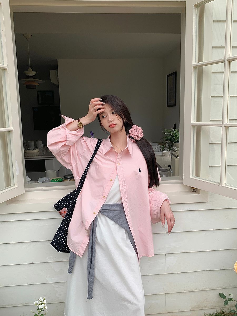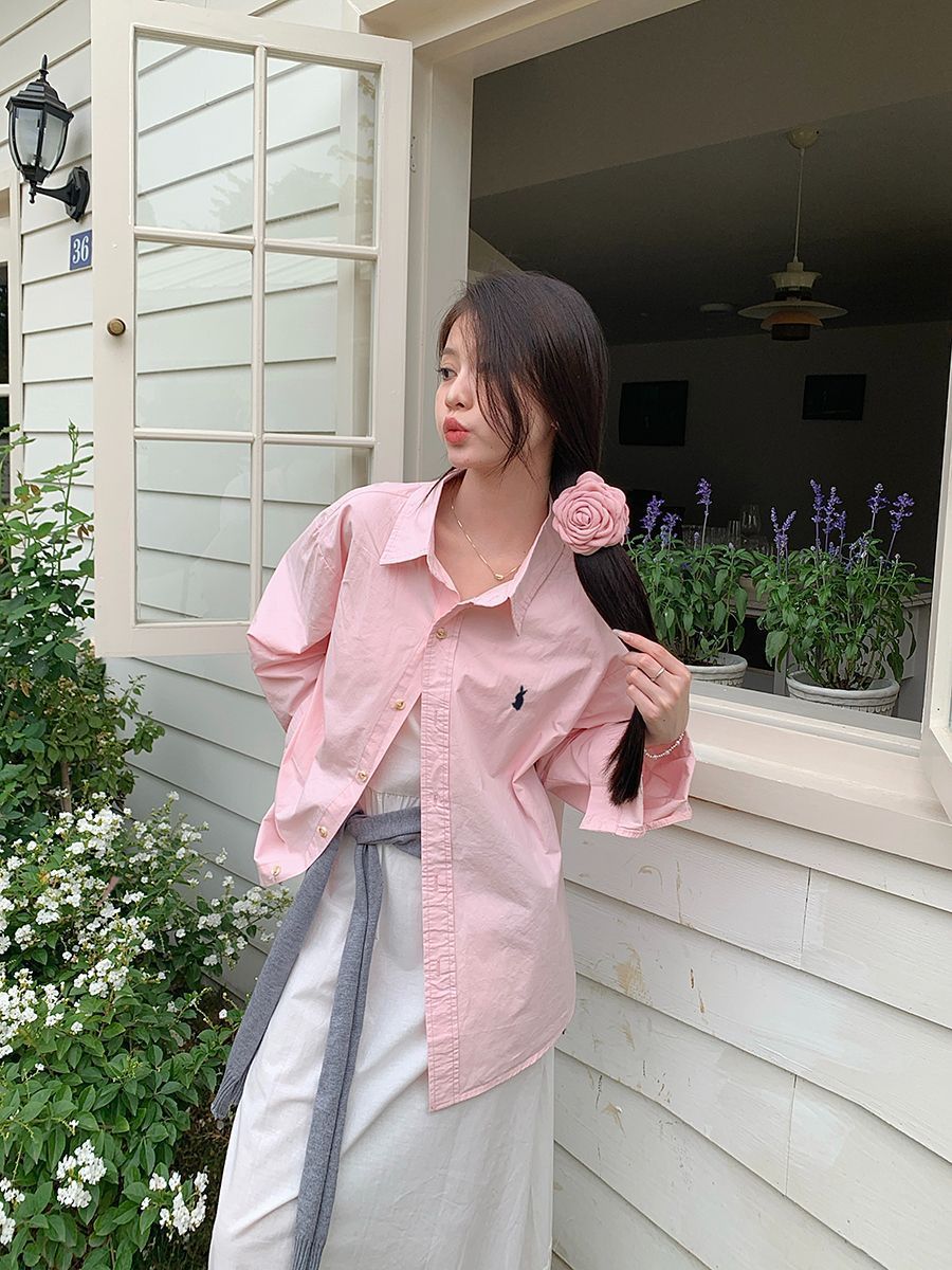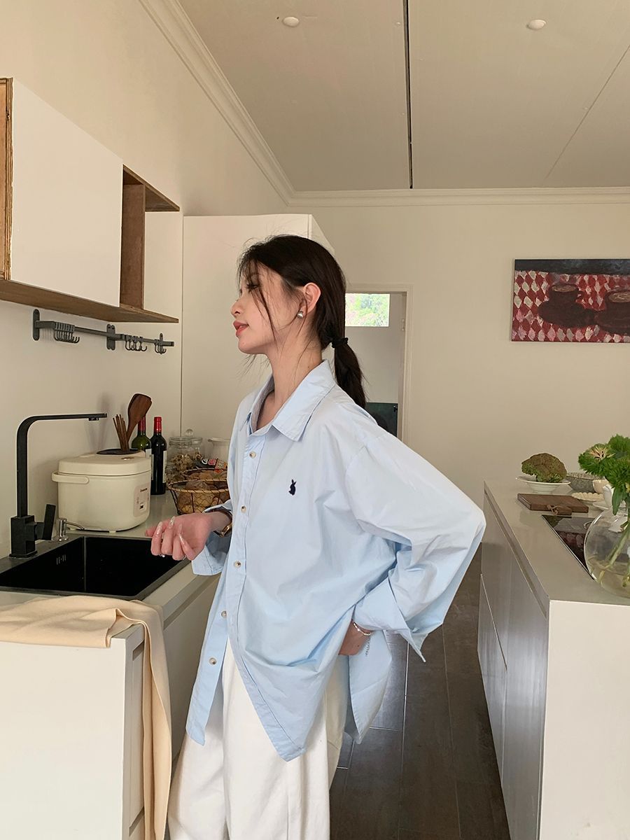 韓国ポロカラーシャツ春の新作無地カジュアルカップル気質長袖トップウサギ刺繍多用途