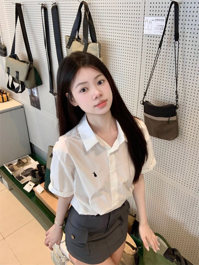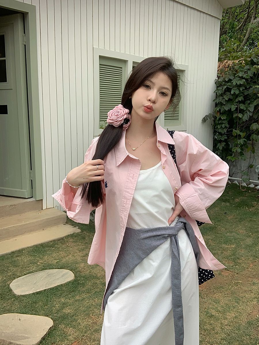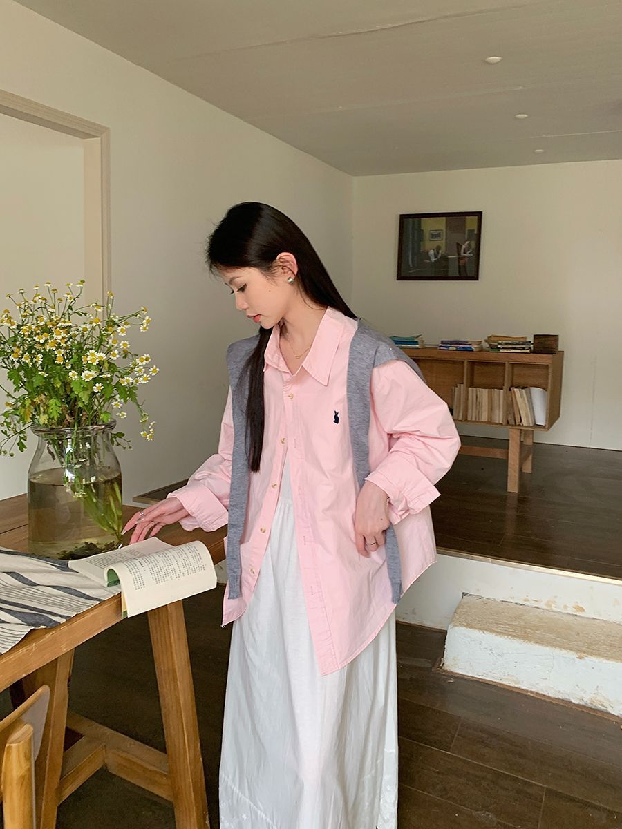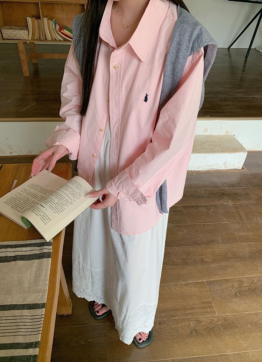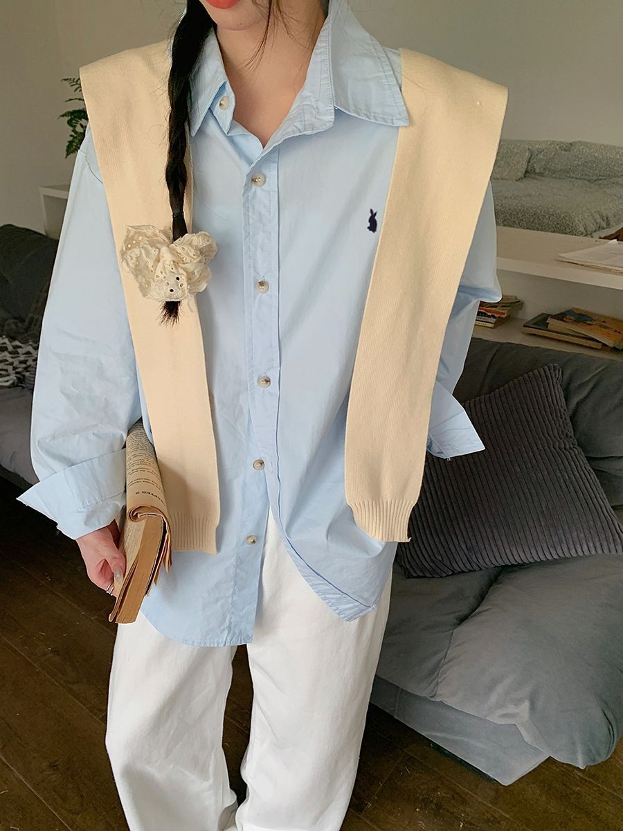 韓国ポロカラーシャツ春の新作無地カジュアルカップル気質長袖トップウサギ刺繍多用途