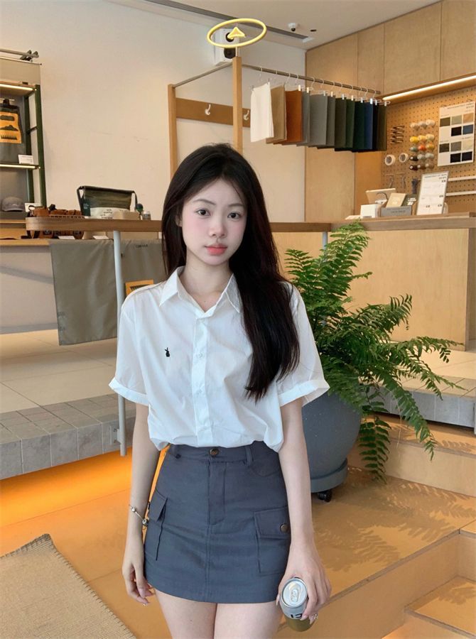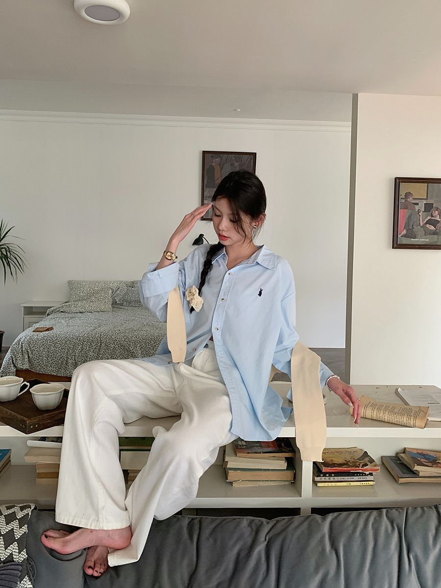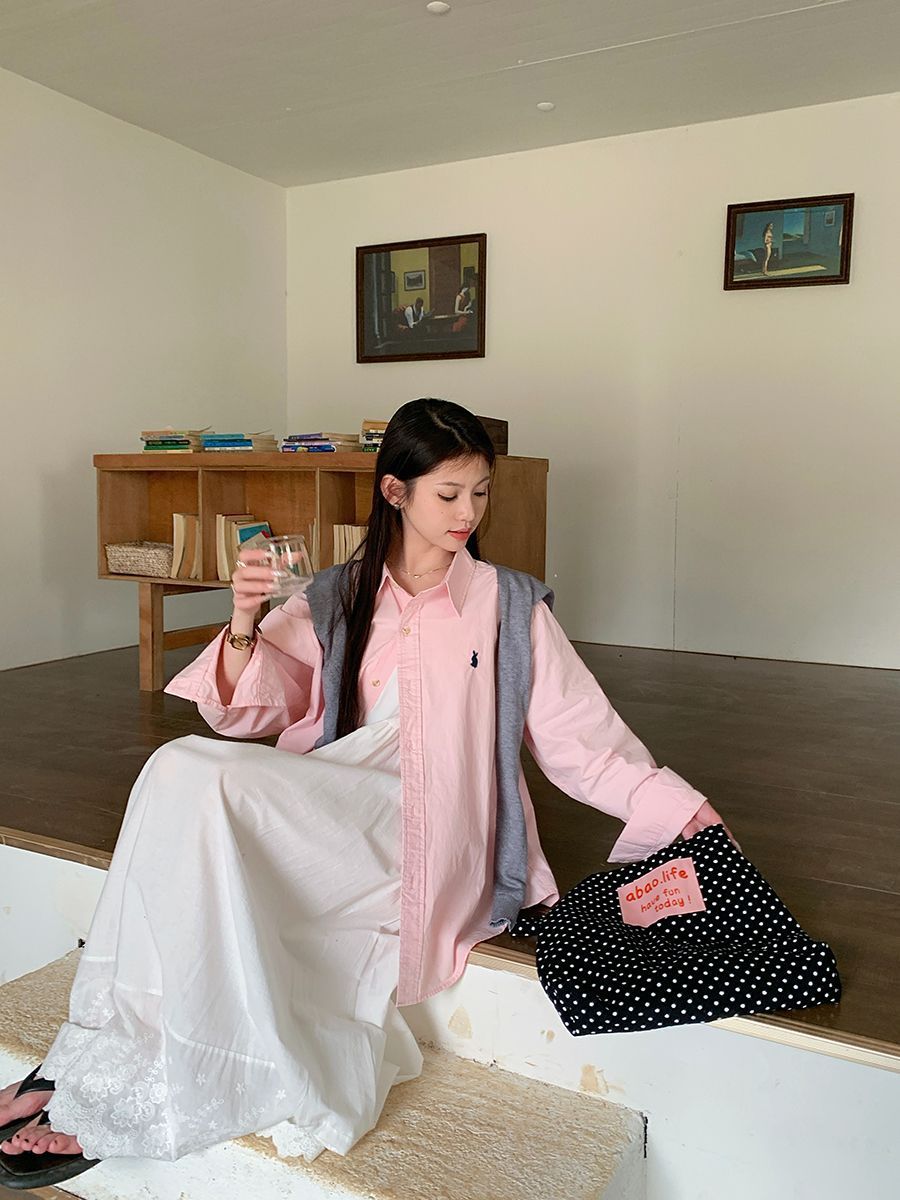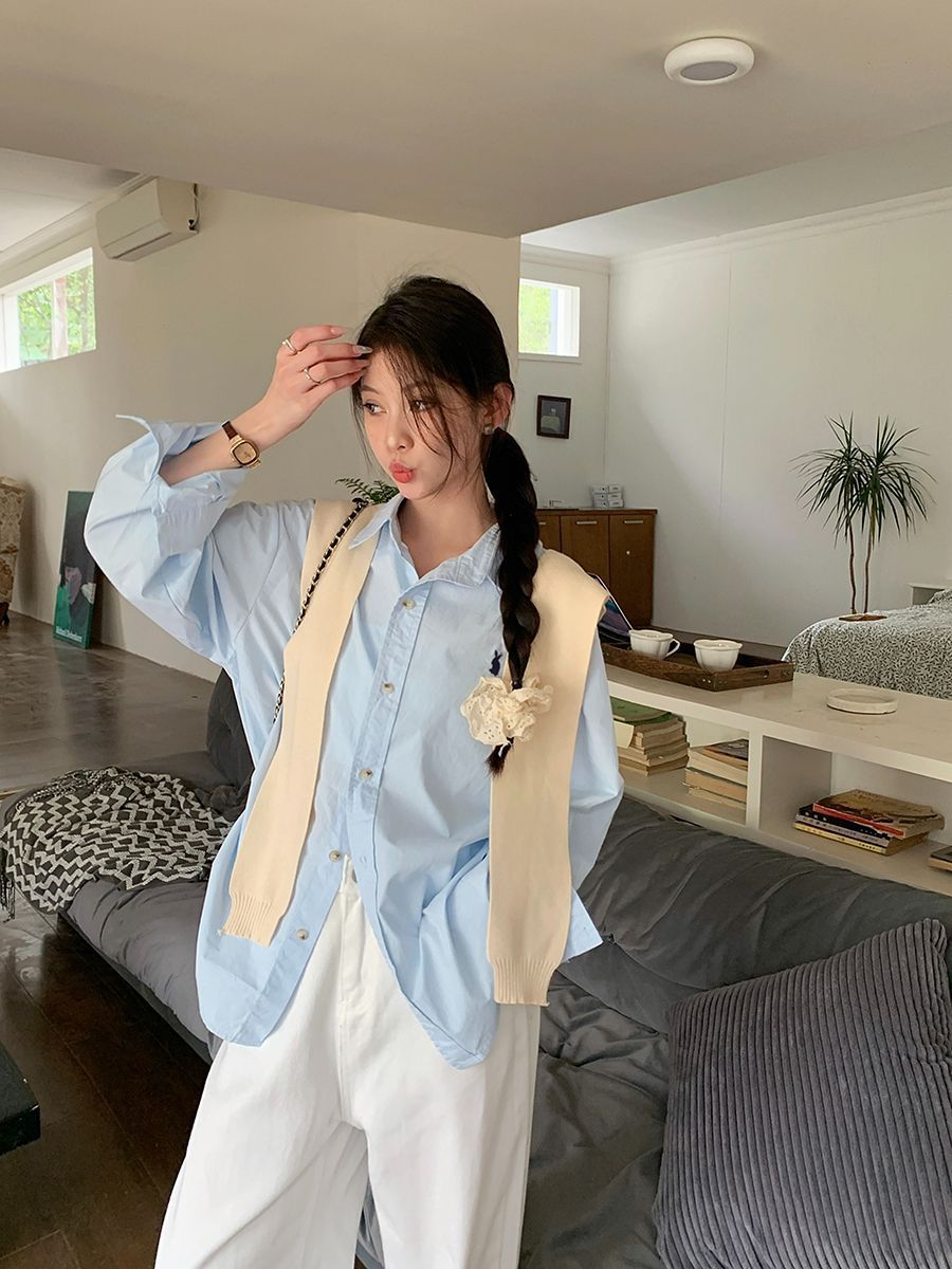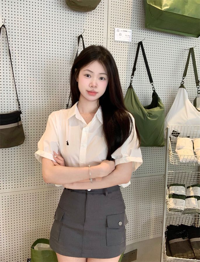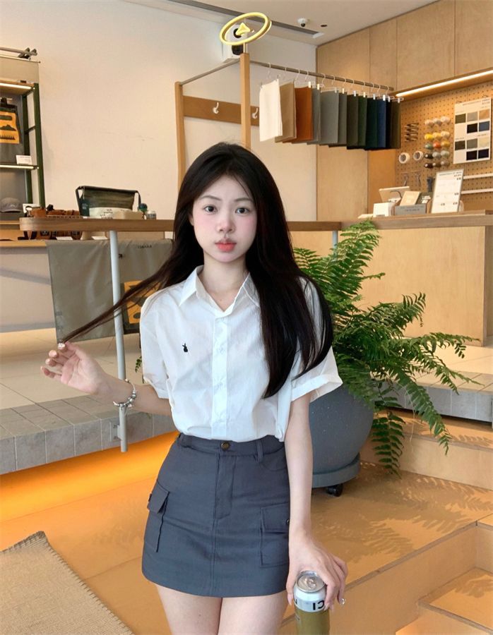 韓国ポロカラーシャツ春の新作無地カジュアルカップル気質長袖トップウサギ刺繍多用途