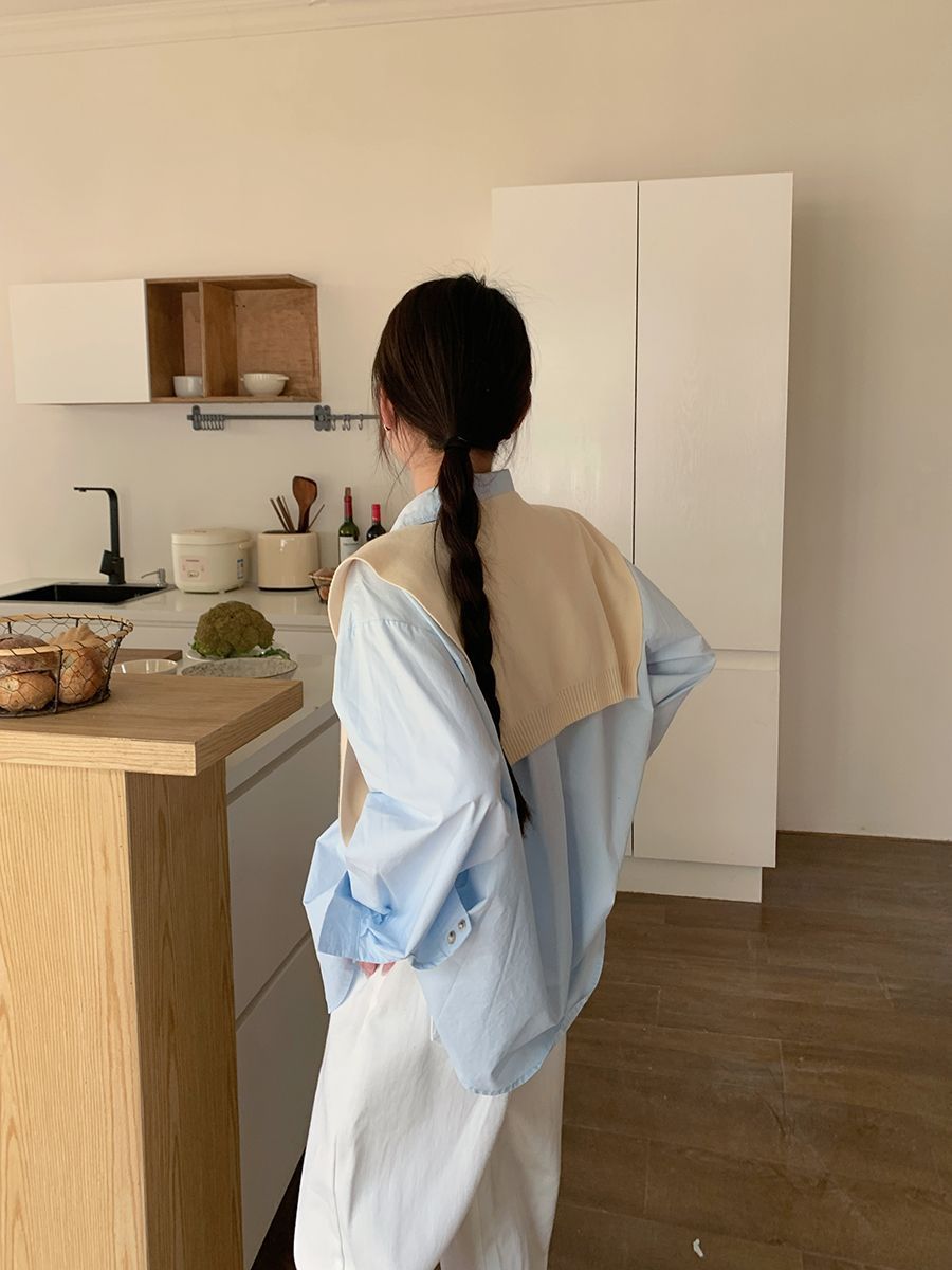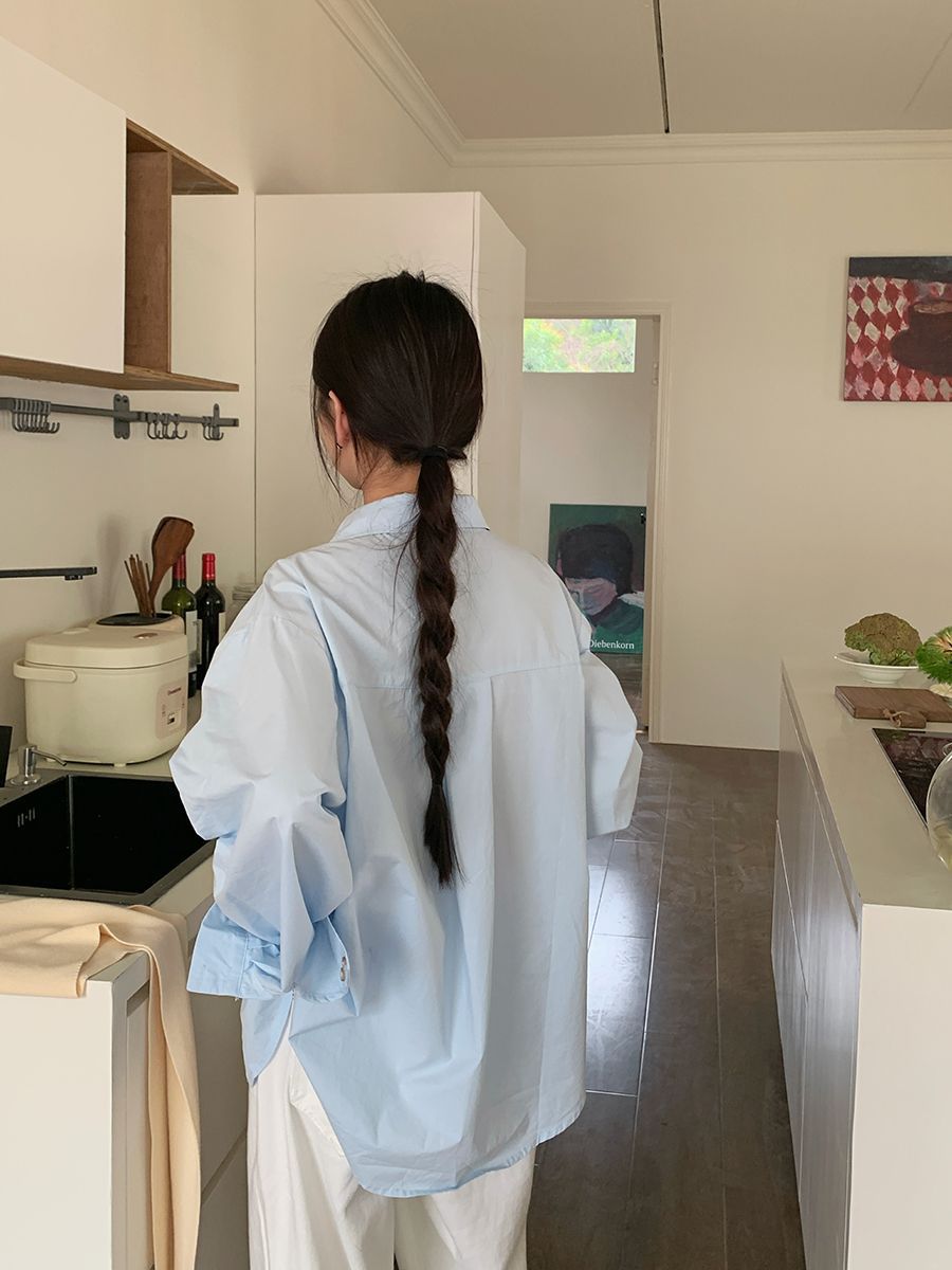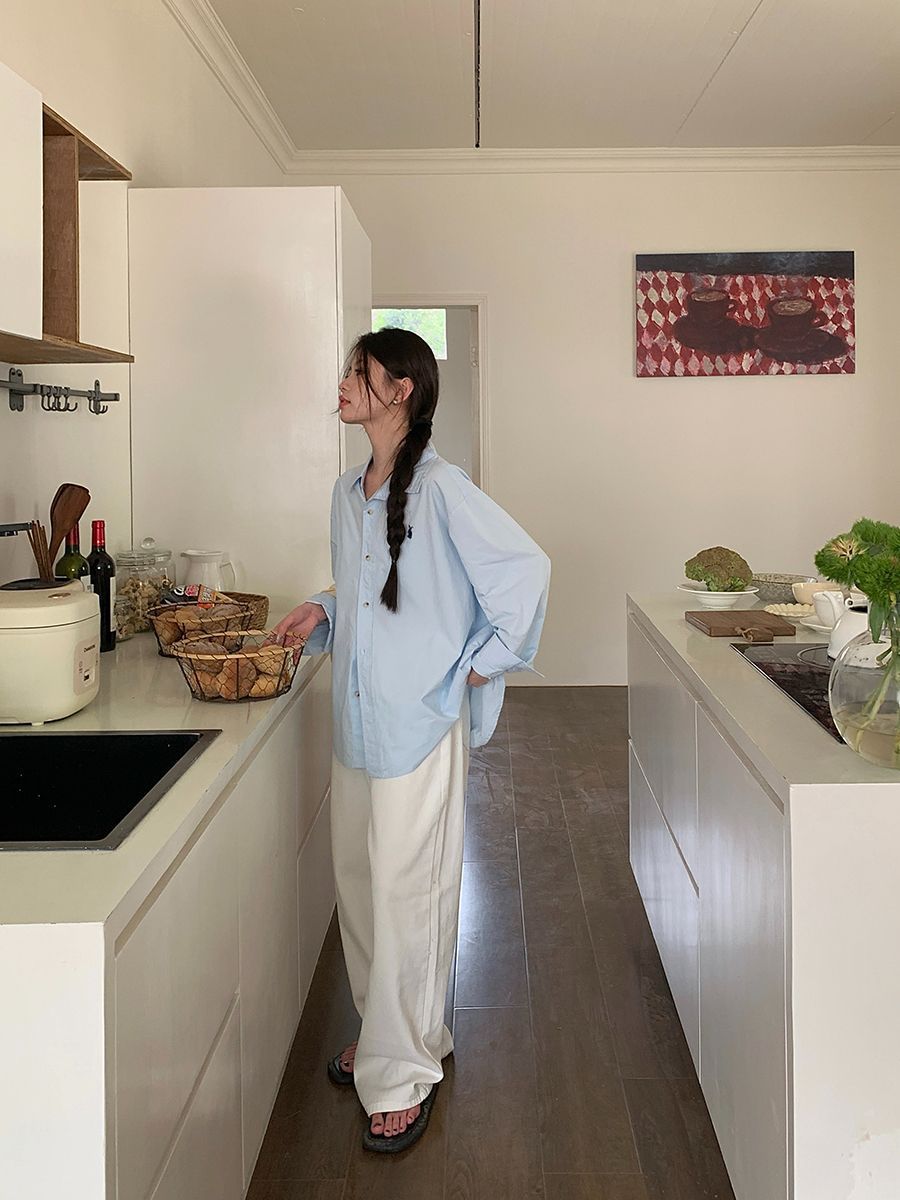 日本製白ラブポロカラーシャツ春新作無地カジュアルカップル気質長袖トップ刺繍多用途